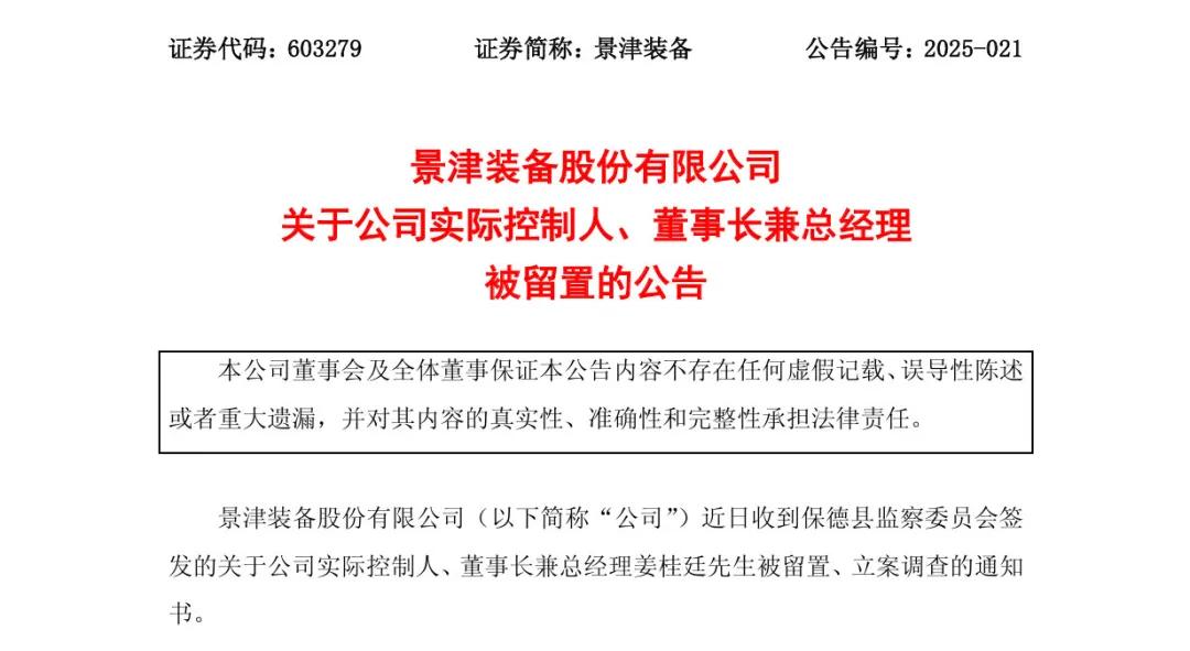 今年6月12日晚间,景津装备(603279.SH)公告称,公司实际控制人、董事长兼总经理姜桂廷被留置。