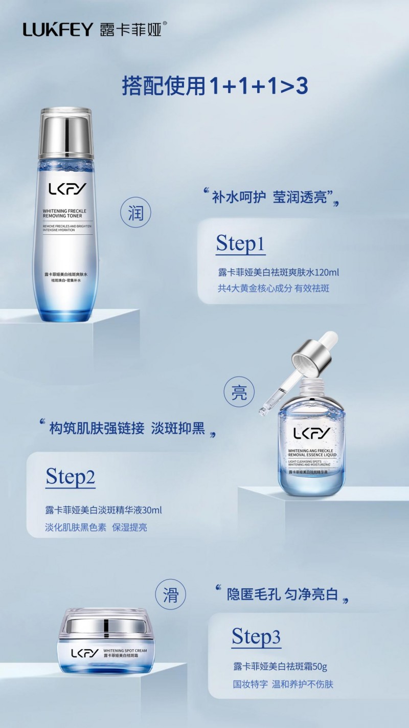搭配合理:这款露卡菲娅祛斑套装精心设计为一套搭配合理的祛斑三件套,包含爽肤水、精华液和祛斑霜,每件产品都经过科学配比,协同作用,能有效改善肌肤色斑问题。使用方法非常简单明了,只需按照爽肤水、精华、面霜的顺序,每日早晚坚持使用,就能逐渐看到肌肤变得更加均匀透亮。