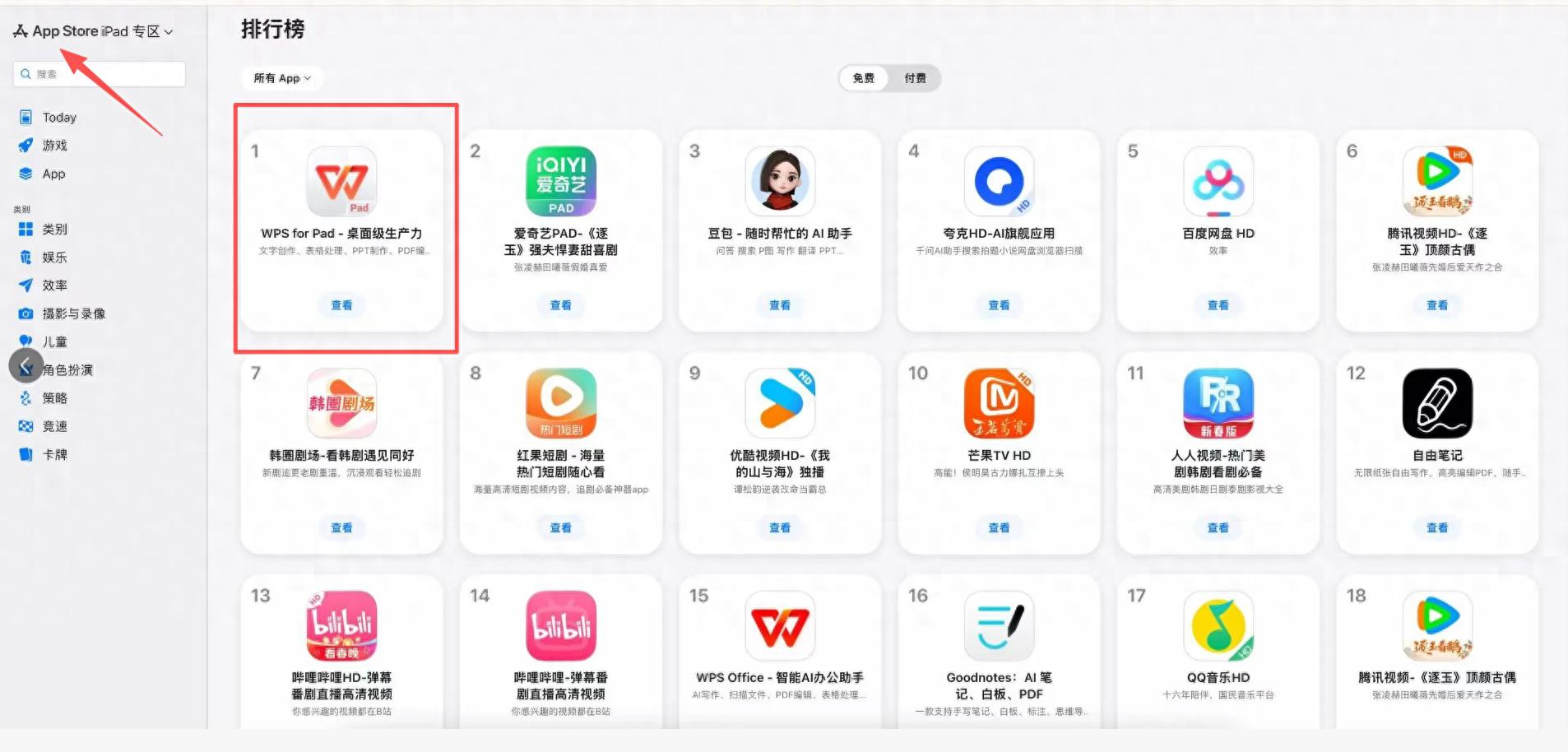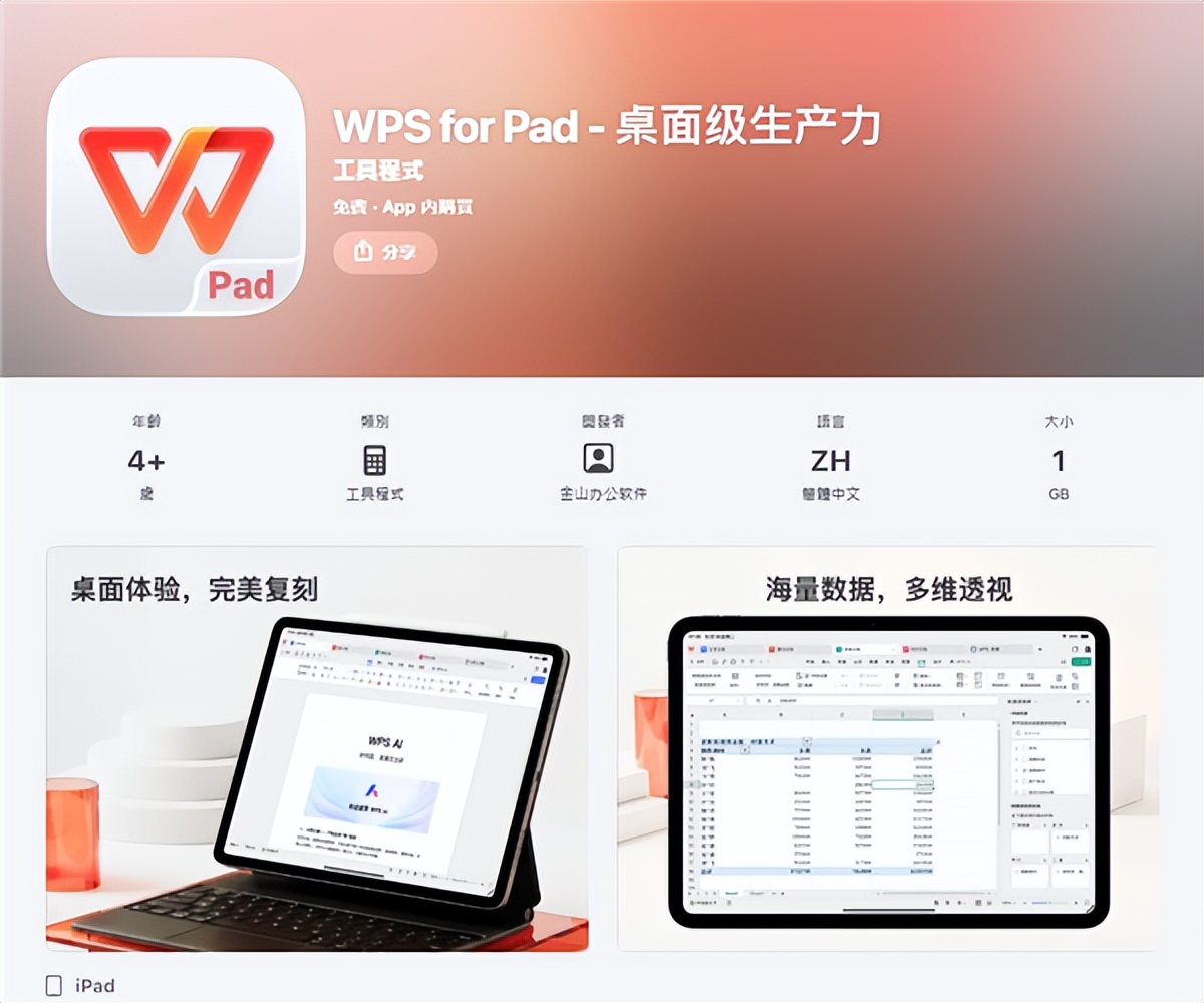 最近,WPS for Pad冲到了苹果iPad应用商店的免费下载榜第一。