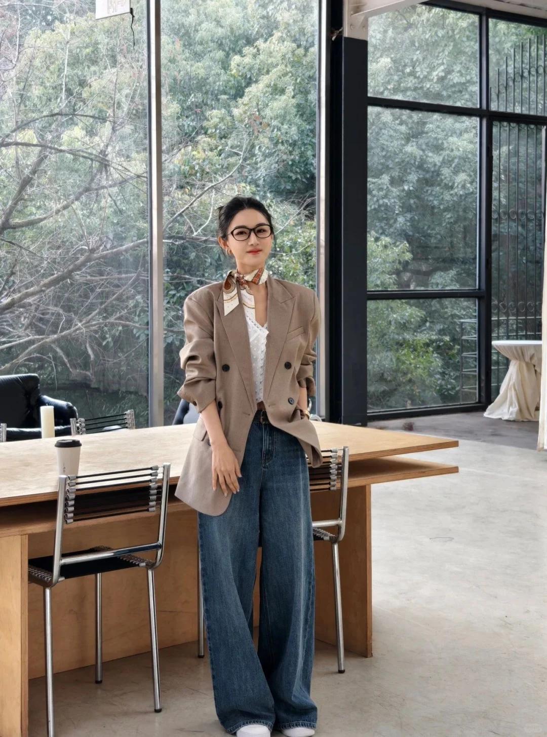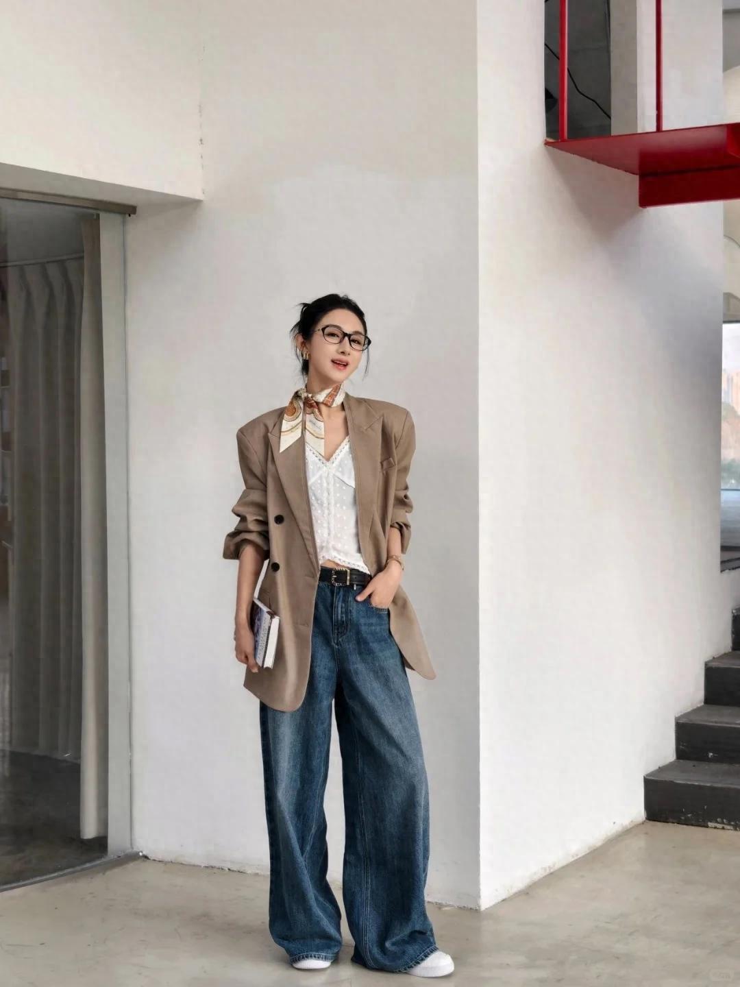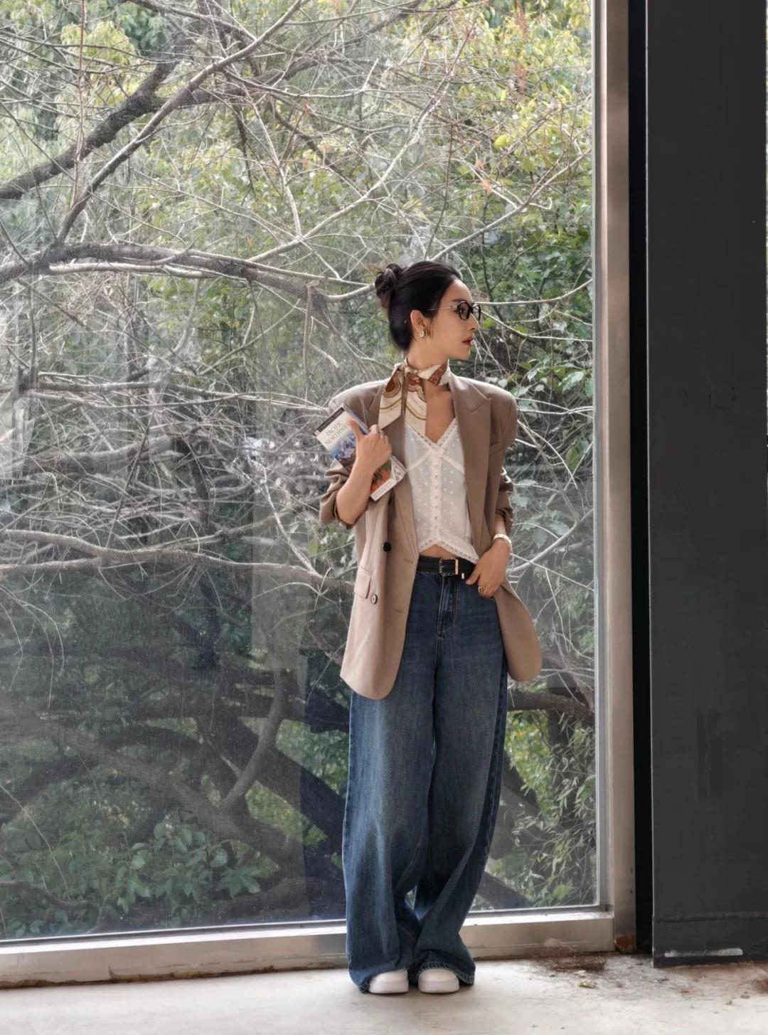 同时,牛仔材质的独特质感,又为整体穿搭增添了一份青春活力与时尚感。 当牛仔阔腿裤与卡其色廓形西装相遇,便碰撞出了奇妙的火花。西装的正式感与阔腿裤的休闲感相互中和,既不会让整体造型显得过于刻板严肃,又不会过于随意而失去职场的专业性。