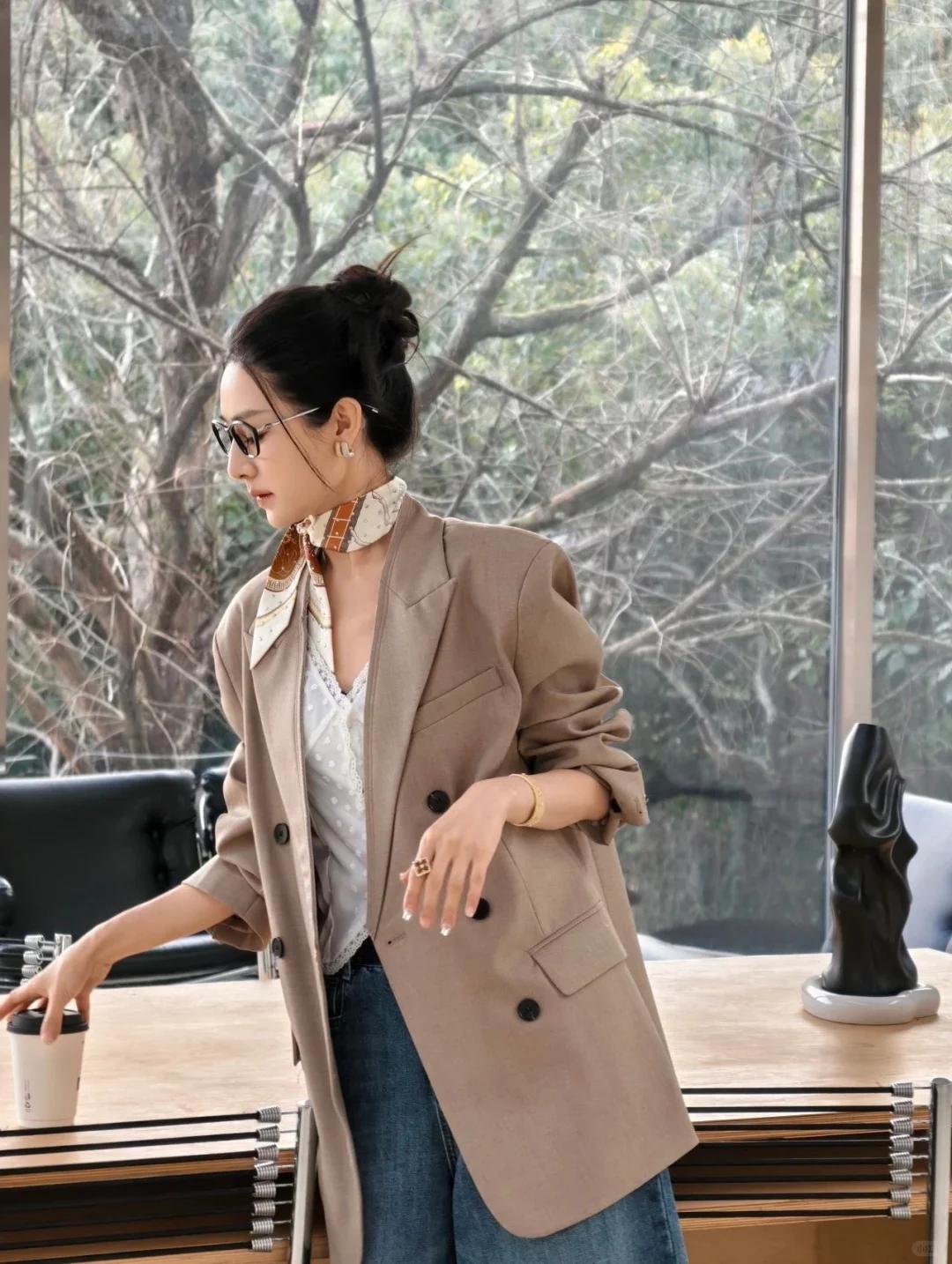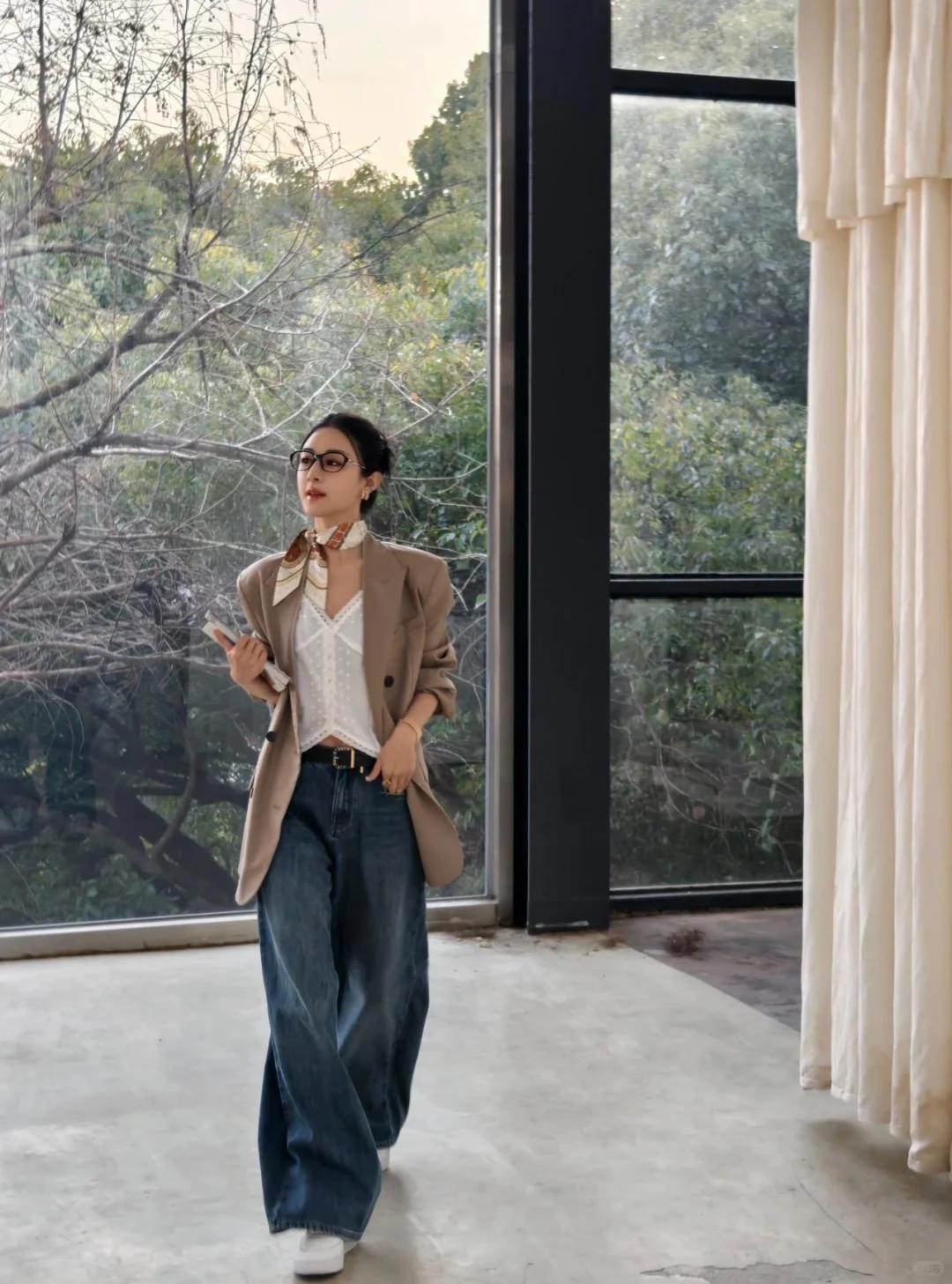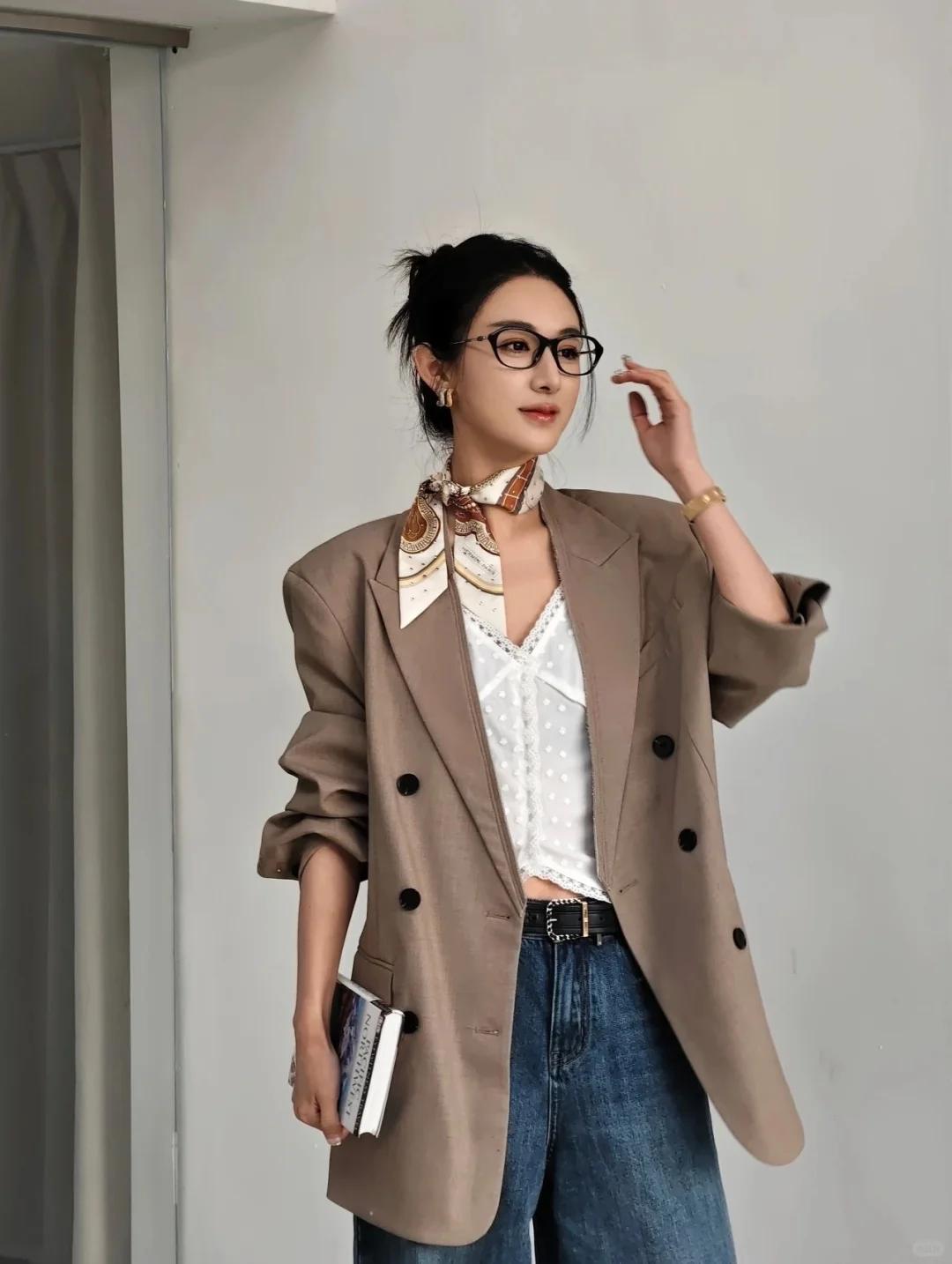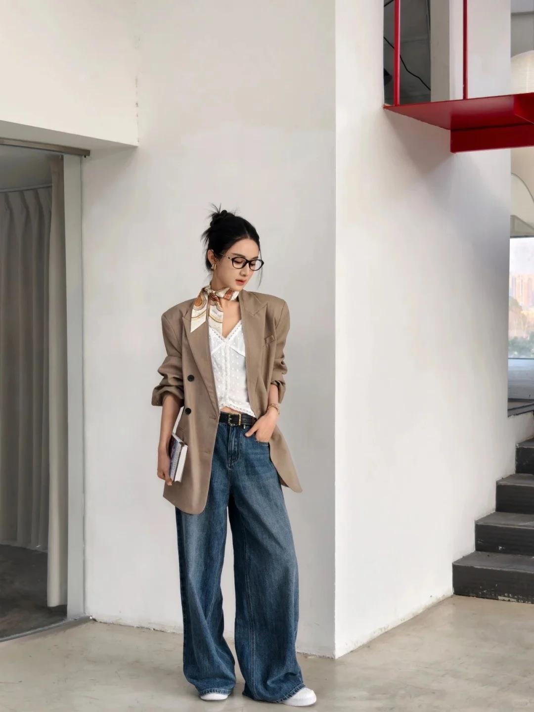 同时,牛仔材质的独特质感,又为整体穿搭增添了一份青春活力与时尚感。 当牛仔阔腿裤与卡其色廓形西装相遇,便碰撞出了奇妙的火花。西装的正式感与阔腿裤的休闲感相互中和,既不会让整体造型显得过于刻板严肃,又不会过于随意而失去职场的专业性。