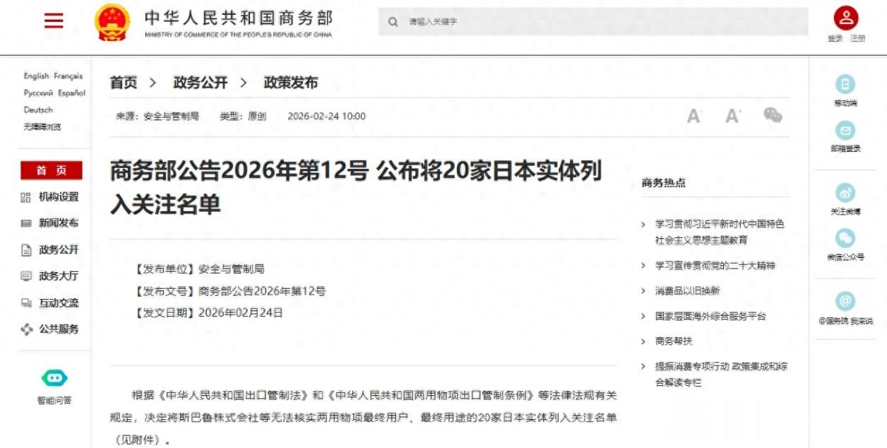春节收假、开工第一天,也就是2月24日,商务部直接甩出重磅公告,20家日本实体被一口气列入出口管制黑名单。