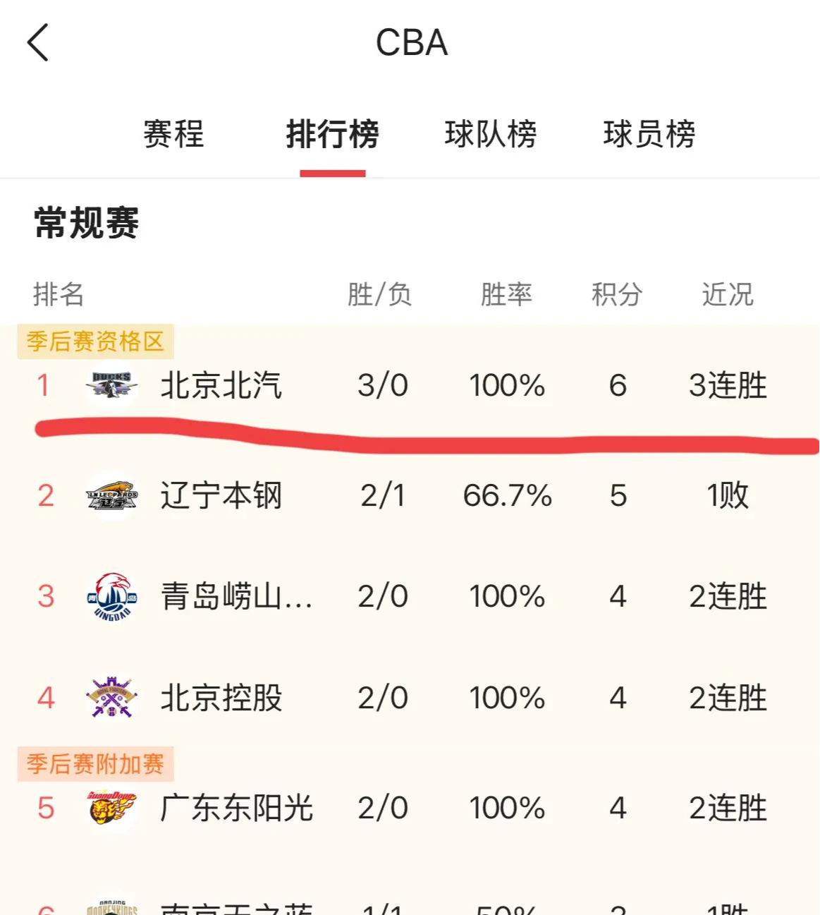北京首钢男篮凭借着含金量十足的胜利,以三战全胜的战绩毫无疑问的登上了新赛季的榜首位置,而输球的辽宁男篮成绩变为两胜1负。占据排行榜第二位。