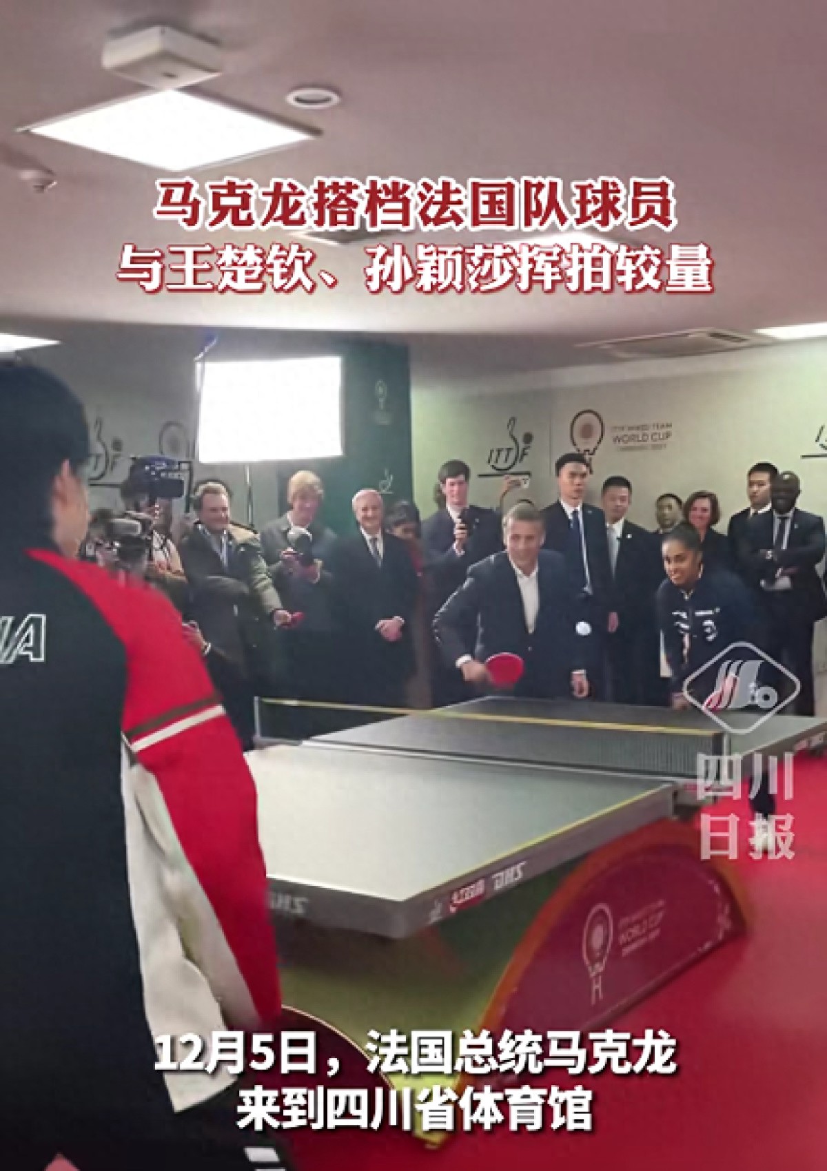12月5日下午,法国总统马克龙访问四川成都期间,来到四川省体育馆看望参加混团世界杯比赛的法国乒乓球运动员,并与法国队球员一起同中国乒乓球运动员切磋球技。