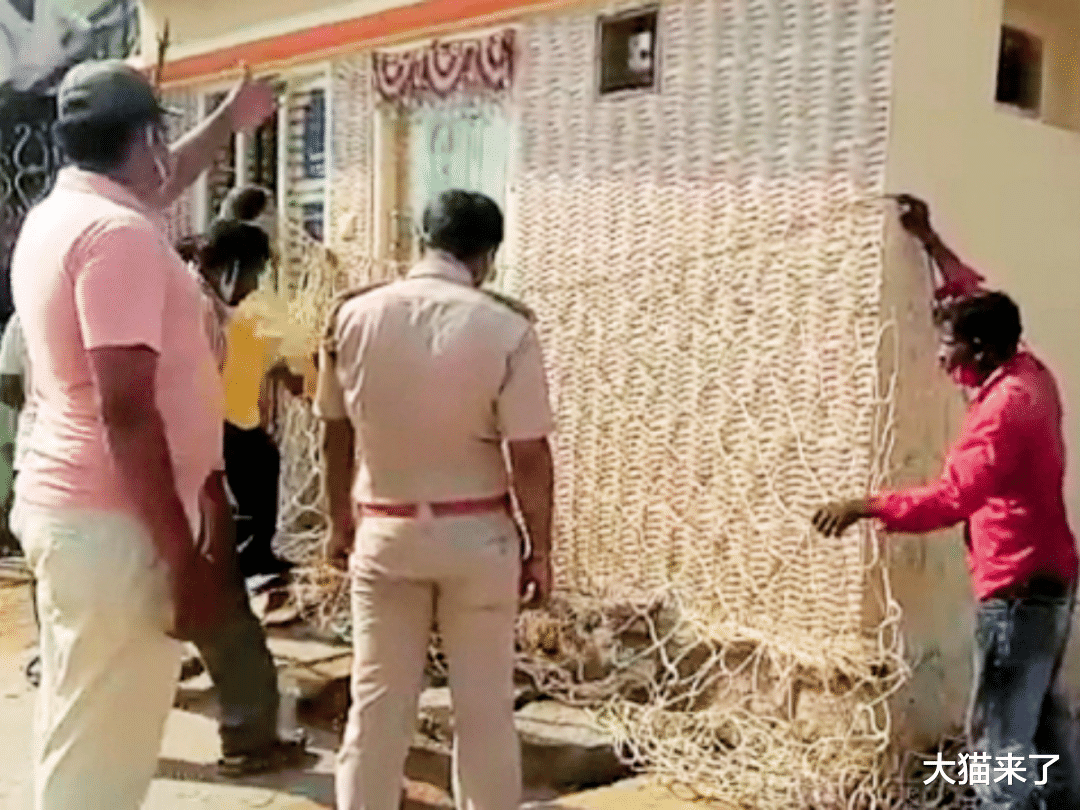 5月8日早上,卡纳塔克邦一个名叫Muddappur的村子里,一只豹子闯入了村民家的厨房,村民发现后将其锁在了里面。不久,救援人员携带着笼子和网赶到现场,用了3个小时才把豹子捉住……