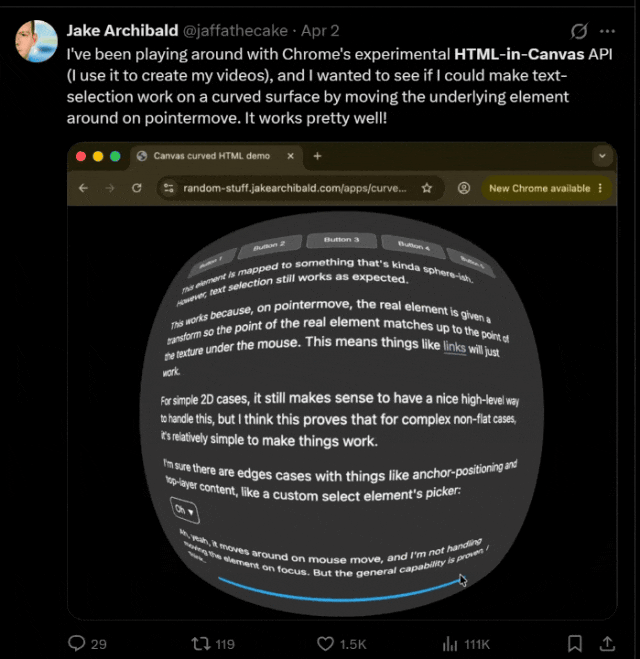 一种比Pretext更颠覆的前端技术 至于如何玩上HTML-in-Canvas,可以看看网友的打样。
