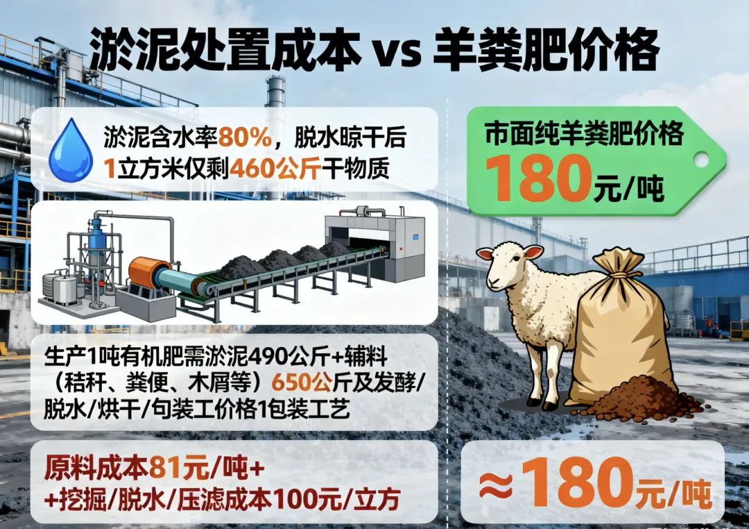 490 公斤淤泥;650 公斤秸秆、粪便、木屑等辅料;以及脱水、发酵、烘干等工艺。按照依安的中标价计算,光是淤泥原料成本就要 80 元左右,再加上脱水、压滤等处理费用,每吨综合成本超过 180 元。
