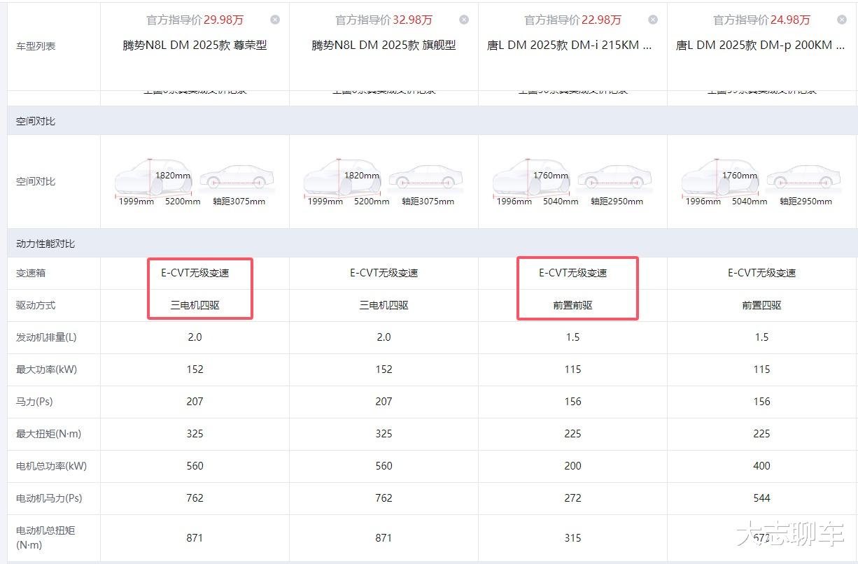 再然后,是配置方面,虽然,很多人说腾势N8L整体的车身比唐L,可大的也不过那么一丢丢而已,也影响不到什么?动力方面,好像也是腾势N8L占据上风,可是,大部分车主用车环境都是在城市道路上开,哪怕动力再好有什么用?跑高速时快一点,可平日里拖着三电机四驱带来的能耗那可远比前置动力和前置四驱要大很多的。