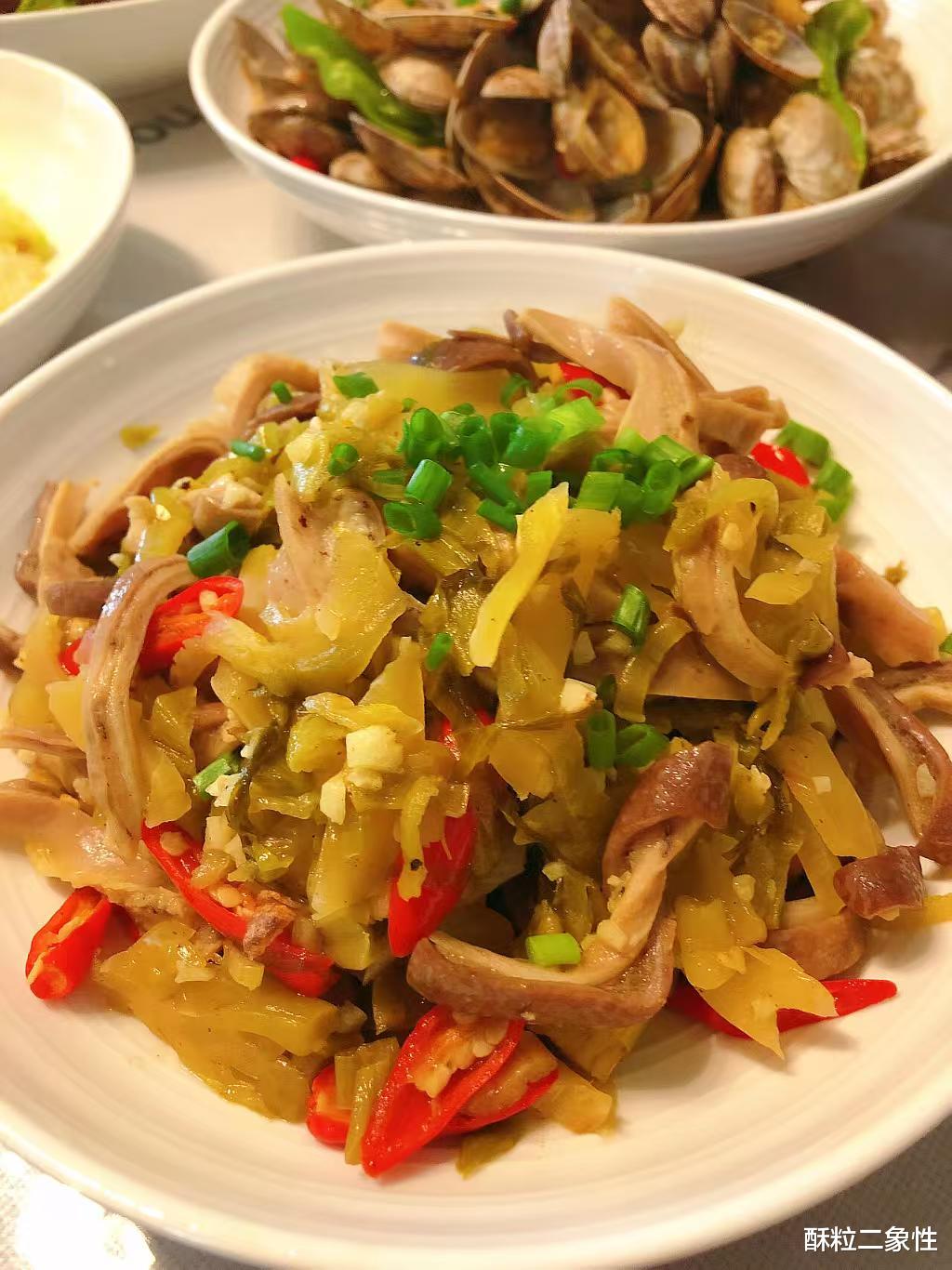 猪肚摊前排队的大爷大妈人手一只,轮到我时,老板啪地把粉嘟嘟的猪肚扔上砧板:“做酸菜?挑厚点的,煮完不塌!”我连连点头,心里暗爽:内行啊。回家先把猪肚翻个面,剪掉多余肥油,撒两把面粉、半勺白酒,里里外外搓到手臂发酸,冲水三遍,直到一点粘液都没有——去腥最管用的不是料酒,是耐心。冷水下锅,丢姜葱、花椒、两片香叶,大火煮开转小火,让它在里面泡“温泉”50分钟。时间没到千万别用筷子戳,一戳气跑了,口感直接老成橡皮筋。