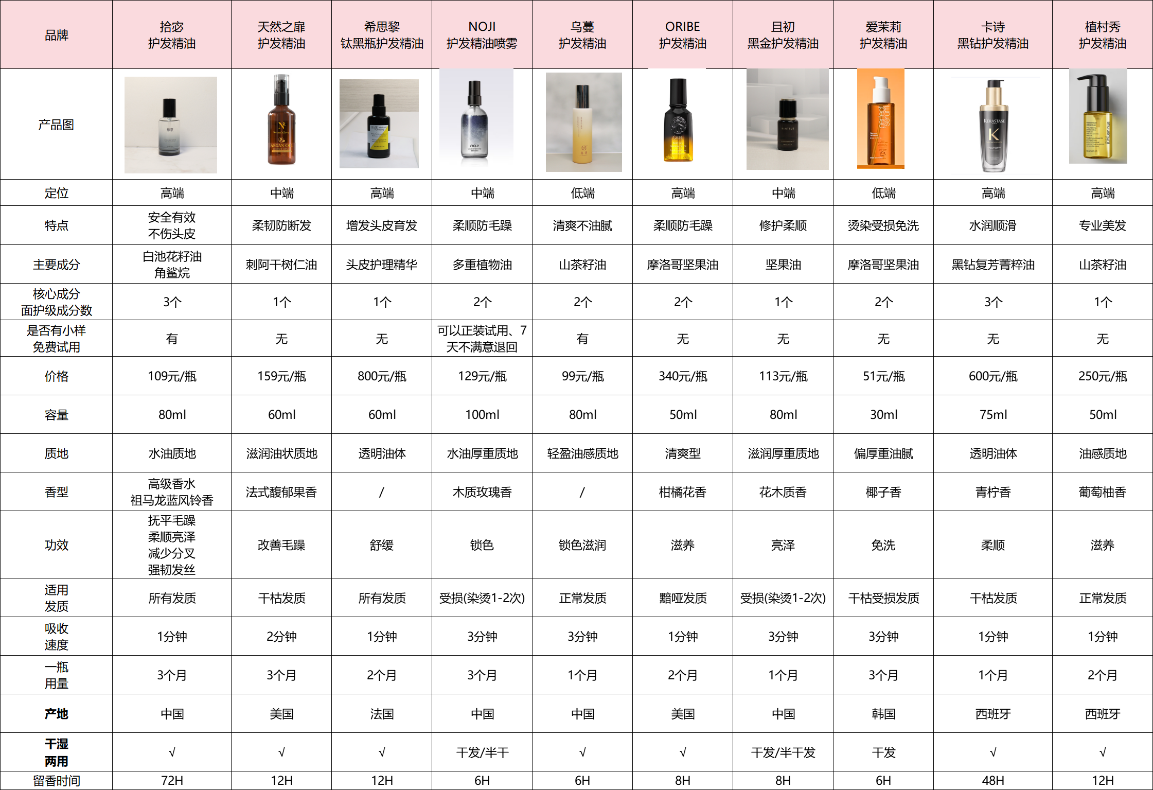 要挑到合适的精油,先把数据放在眼前真的很重要。表格里列出几款护发精油的基础信息,我自己对比的时候才发现差距有多大,看完再决定也不迟。