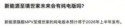 去年广州车展,一辆理想MEGA首发亮相,新能源中大型MPV市场一夜之间热闹了起来,各大品牌纷纷加速产品研发节奏。就在近日,别克汽车也确认:旗下高端MPV至境世家纯电版将在2026年上半年上市。这条消息让不少追求大空间、高科技配置却又在意零排放的用户充满期待。纵观当前售卖的至境世家插混车型,其售价已达43.99万-46.99万元,而纯电版本预计定位更高,直面极氪009、理想MEGA甚至蔚来EF9这些新能源巨头的前压。