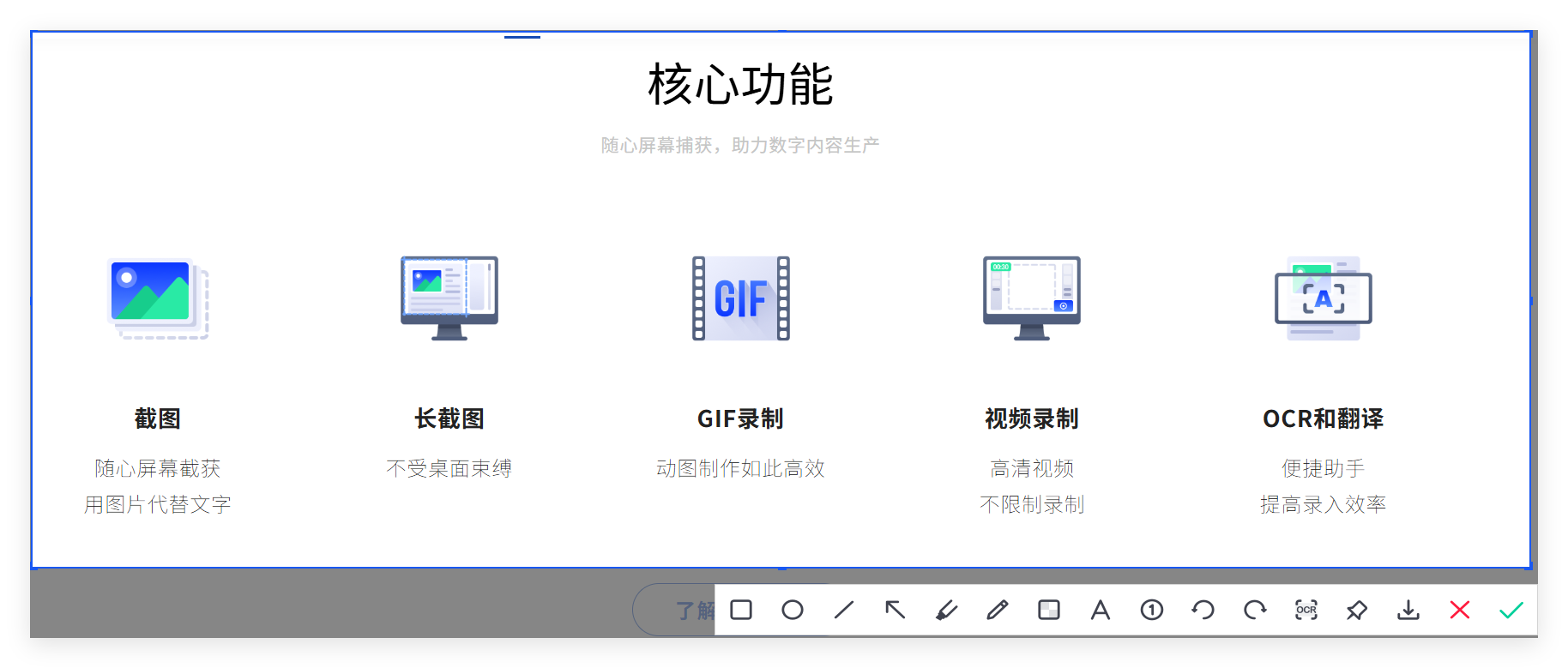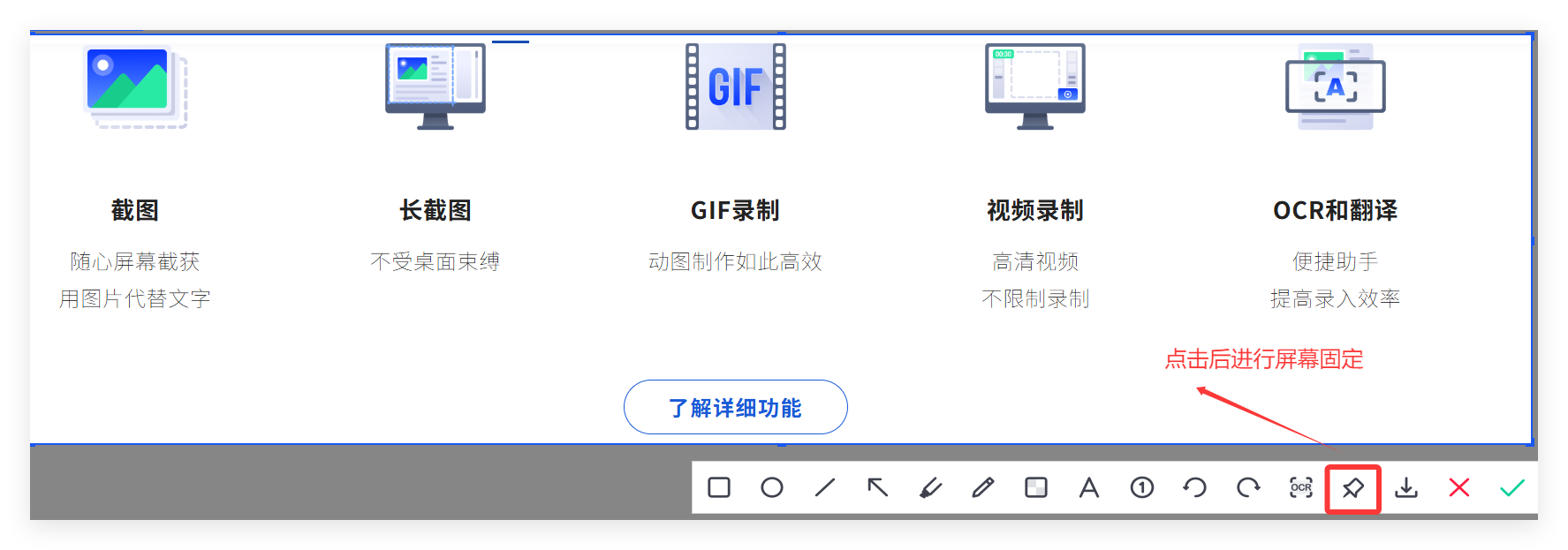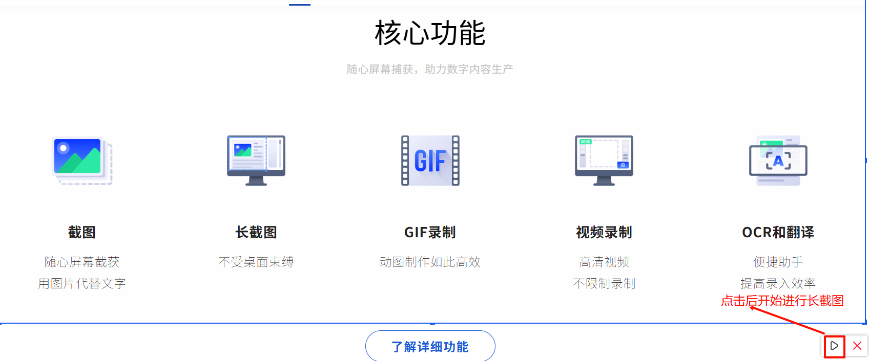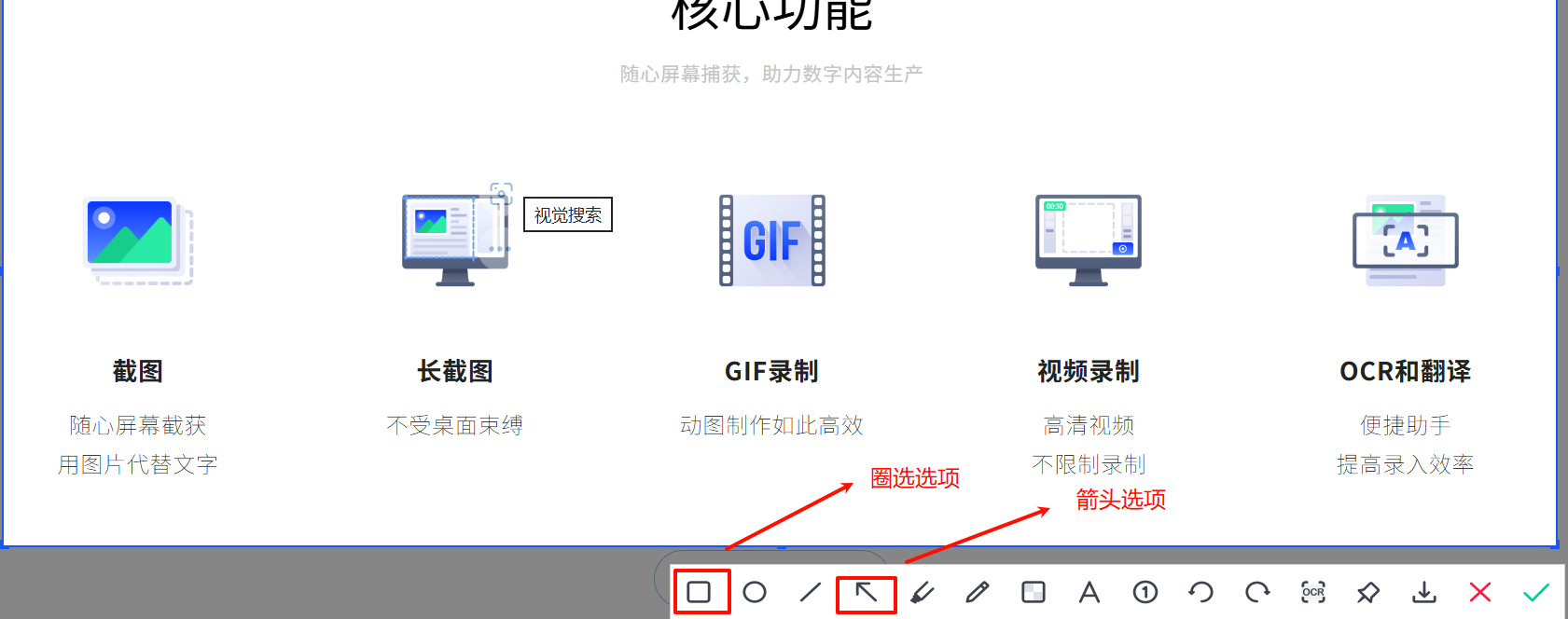触发截图后,圈选和箭头所处位置如下所示: