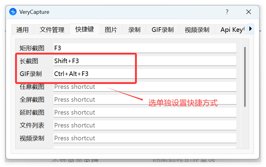 为了方便使用,需进行快捷键设置,这里我只对长截图和 Gif 动图录制进行了设置: