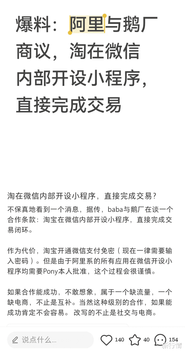 若合作落地,将成为阿里电商生态与微信社交生态首次在核心交易链路上的“双向打通”——微信开放超12亿月活的流量入口,淘宝让渡部分支付主导权,打破此前“社交流量-电商交易-支付工具”间的壁垒。