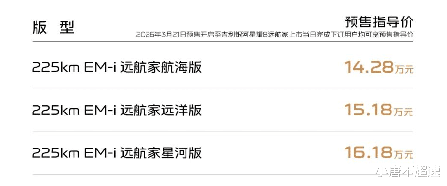 3月21日,吉利银河品牌旗下中大型轿车——星耀8远航家正式开启预售。新车共推出三个版本:225km EM-i远航家航海版、225km EM-i远航家远洋版和225km EM-i远航家星河版。此次预售新增“日照金”和“丹霞矿”两款车色,进一步丰富了消费者的个性化选择。