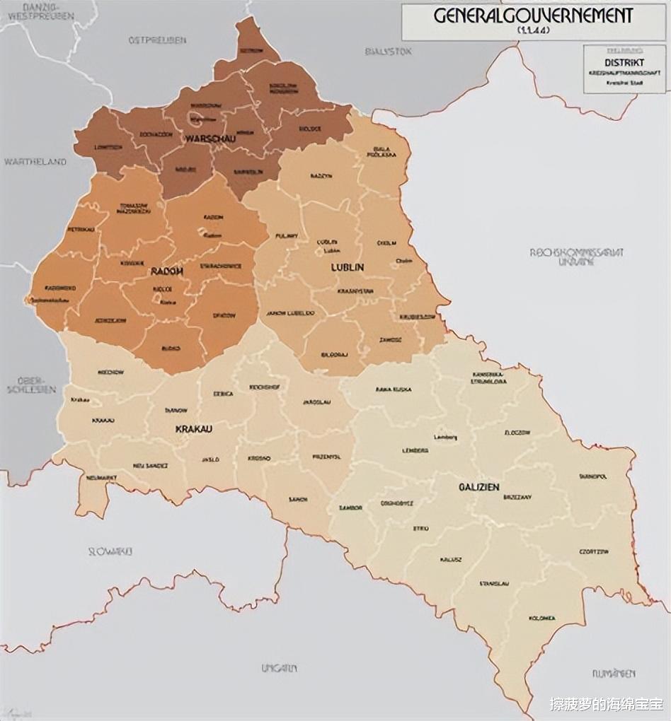 波兰总督府划分为四个区,分别为华沙区、卢布林区、拉多姆区和克拉科夫区,1941年6月德国进攻苏联后,原来乌克兰的东加利西亚划入波兰总督府成为第五个区加利西亚区。五个大区进一步划分为城镇区和乡村区。根据1941年9月15日的一项法令,大多数波兰城市都改为历史上的德国城市名,如果没有,就使用德语版。