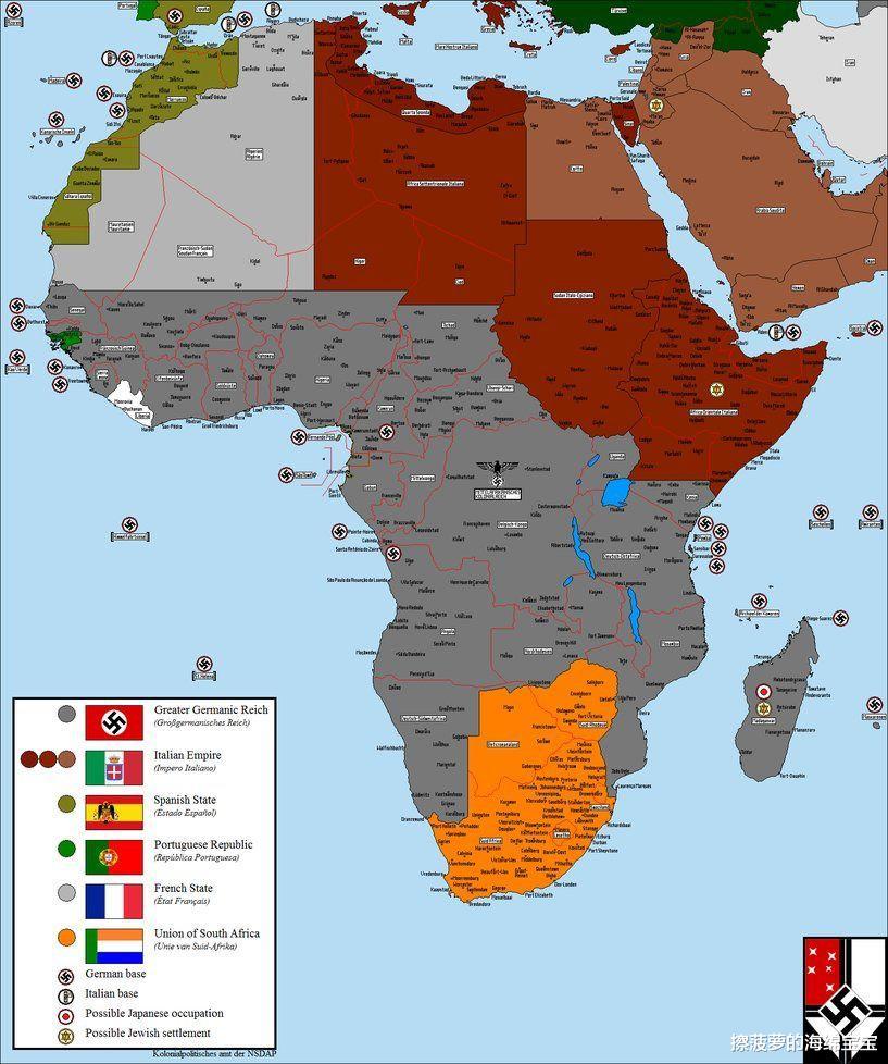 非洲大陆将由德国和意大利瓜分,北非和东非将归意大利所有,中非归德国所有。南部将成为一个南非殖民地国家,法国和西班牙的殖民地将保留。