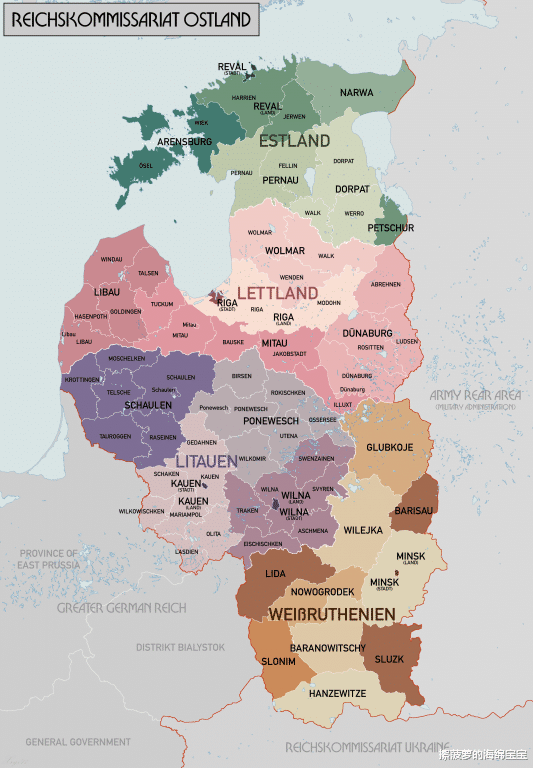 奥斯特兰总督辖区:包括波罗的海国家,白俄罗斯和波兰东北部。总督为欣里奇·洛瑟(Hinrich Lohse),首府为拉脱维亚的里加(Riga)。奥斯特兰总督辖区分为四个总区(Generalbezirke),分别为爱沙尼亚、拉脱维亚、立陶宛和白俄罗斯,每个总区由一名总专员(Generalkommissar)管理。三个波罗的海国家再分为主区(Hauptgebiete)由主专员管理(Hauptkommissars),主区下分为地区(Kreisgebiete)由区专员管理(Gebietskommissars),白俄罗斯没有主区,只有地区划分。