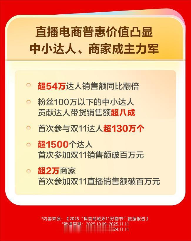 抖音电商2025年双11数据报告就显示,超过54万达人实现带货销售额同比翻倍,其中粉丝量在100万以下的中小达人贡献了达人带货总销售额超八成。同时,超130万名达人是首次参与大促,其中超过1500位销售额突破百万元。