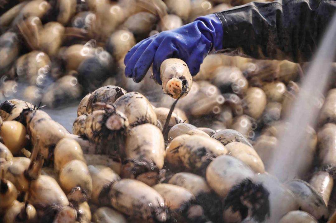随着销量激增,挖藕工变得抢手,工资也水涨船高。高压水枪取代铁锹,冲开淤泥,效率大幅提升——从原来人工日挖100-200斤,提高到500-600斤,工人月入最高两万,且能连续工作七个月。如今,颜姐挖藕团队中已出现了70后、80后的身影,荷塘迎来了年轻人。