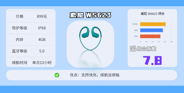 索尼 WS623 具备 IPX8 防水与 IP6X 防尘能力,防护性能相当全面,可适用于游泳、淋浴及高湿度训练环境。机身自带 4GB 独立存储,可直接播放 MP3,不必携带手机也能在水下畅听音乐。整体造型轻巧利落,蓝色外观具有运动感,流线型设计也让水下阻力更小,更适合泳者长期训练。