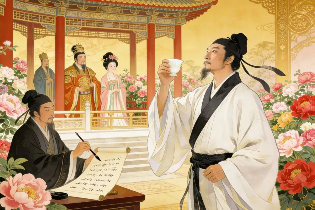 唐玄宗与杨贵妃在沉香亭赏牡丹,急召李白赋诗,他挥笔写下 **“云想衣裳花想容,春风拂槛露华浓”** 的千古名句,龙颜大悦;