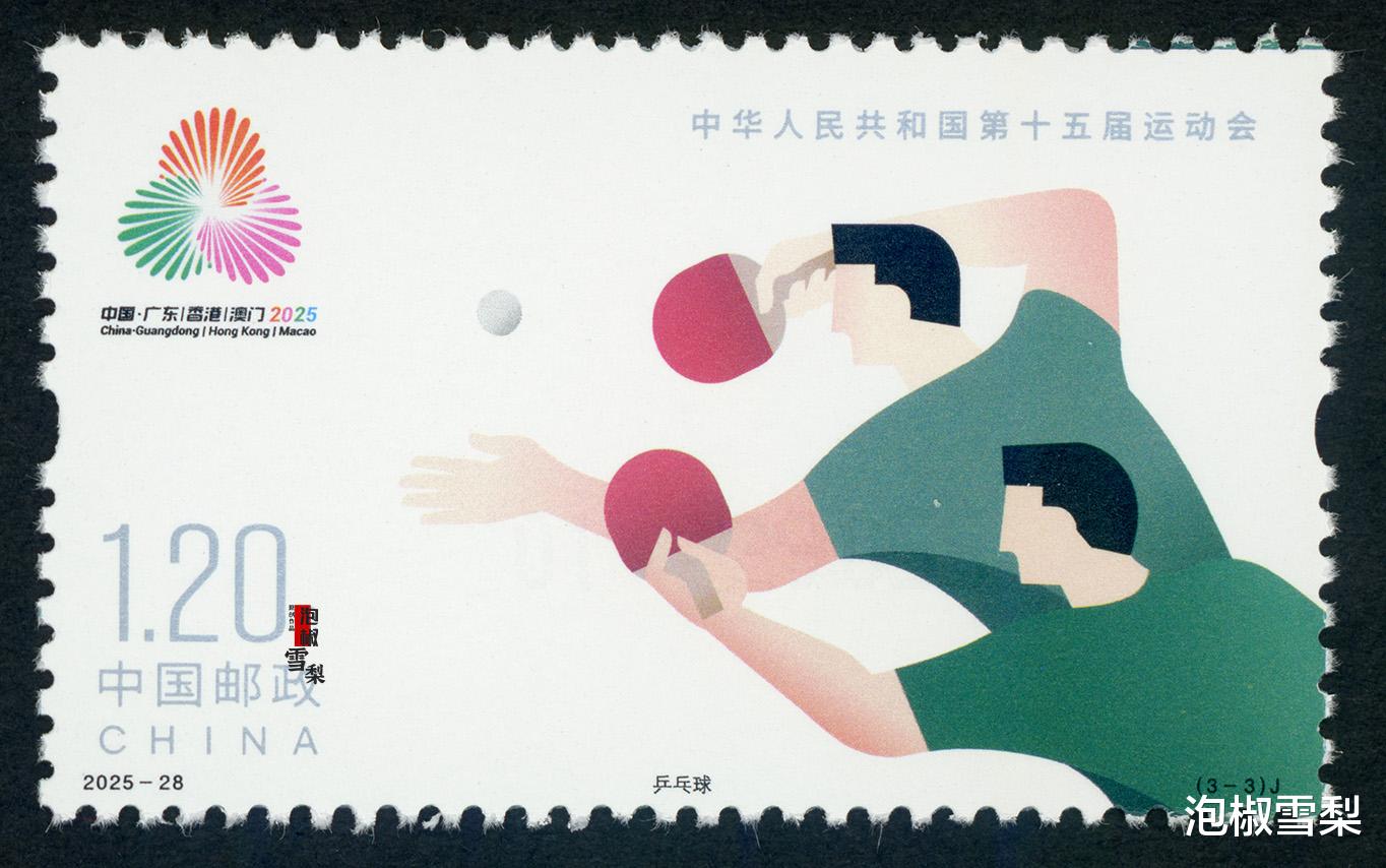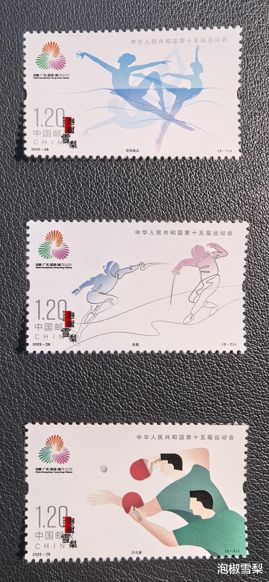 2025年11月9日,中国邮政发行《中华人民共和国第十五届运动会》邮票1套3枚,版式二包含2套6枚,三地小全张1枚,包含中国邮政香港澳门邮票各1套,北京邮票厂胶版印刷,设计者韩家英、陈幼坚、欧俊轩,计划发行量500万套;版式二69.3万版,折合套票138.6万套;小全张中国邮政版10万版,全部总面值至少2334.96万元。
