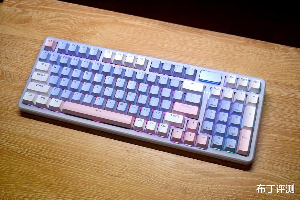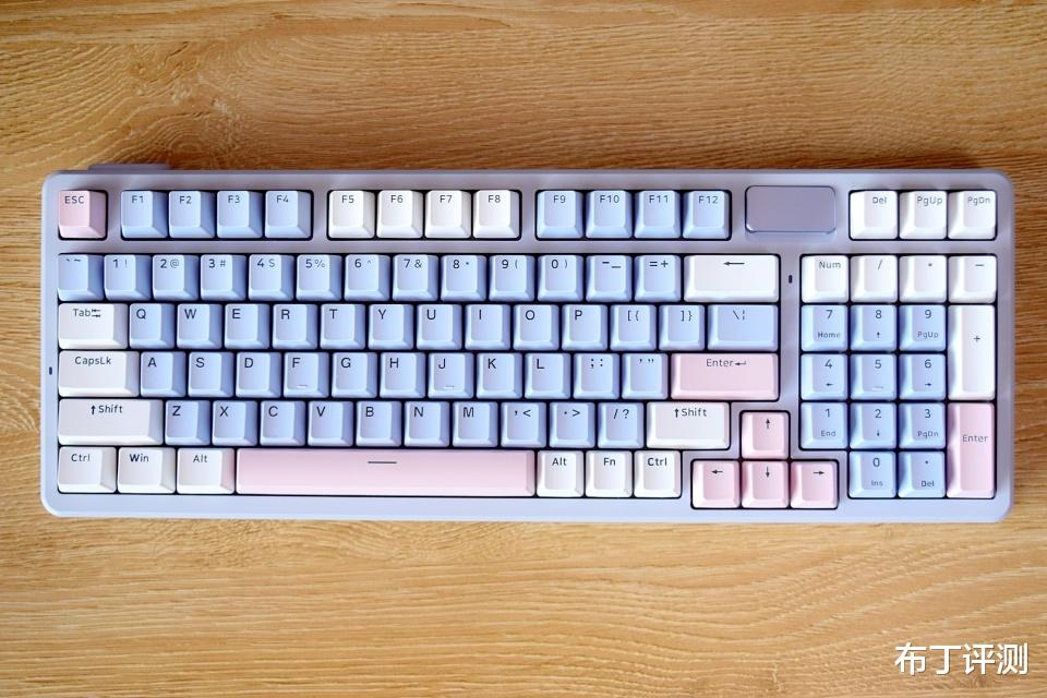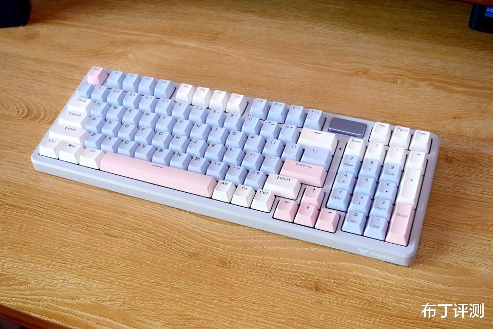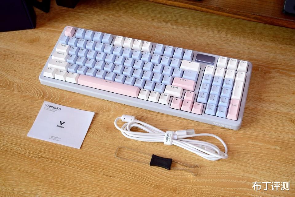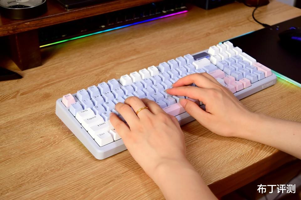 雷柏V700DIY-98采用97键布局,像我手中的莫奈仙踪版本,采用白、蓝、粉三种配色键帽,而且支持全键无冲突、96键可编程,可以轻松满足用户的多种使用需求。