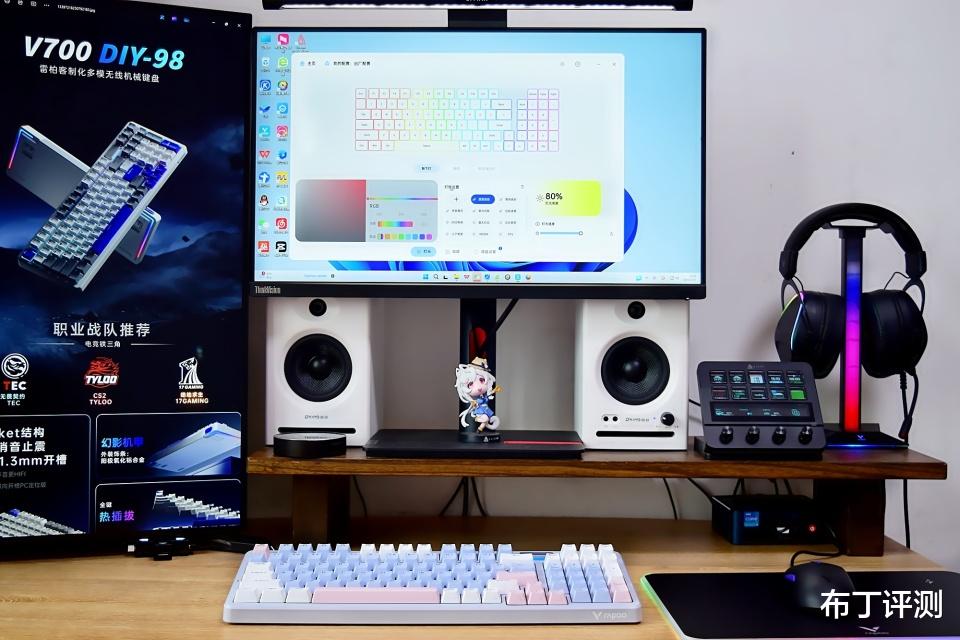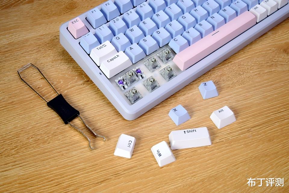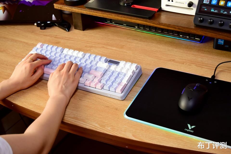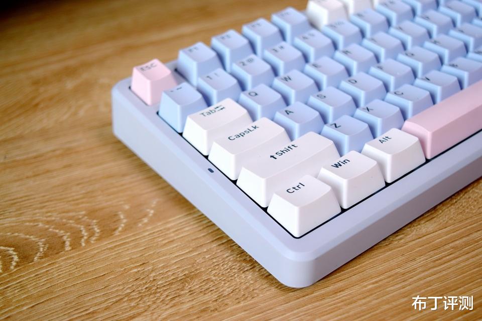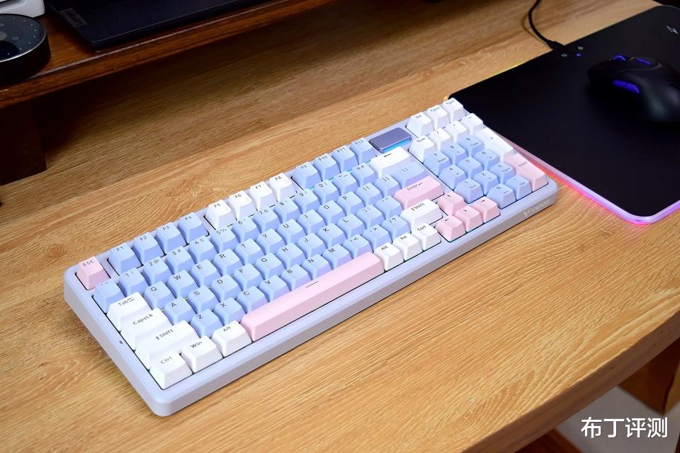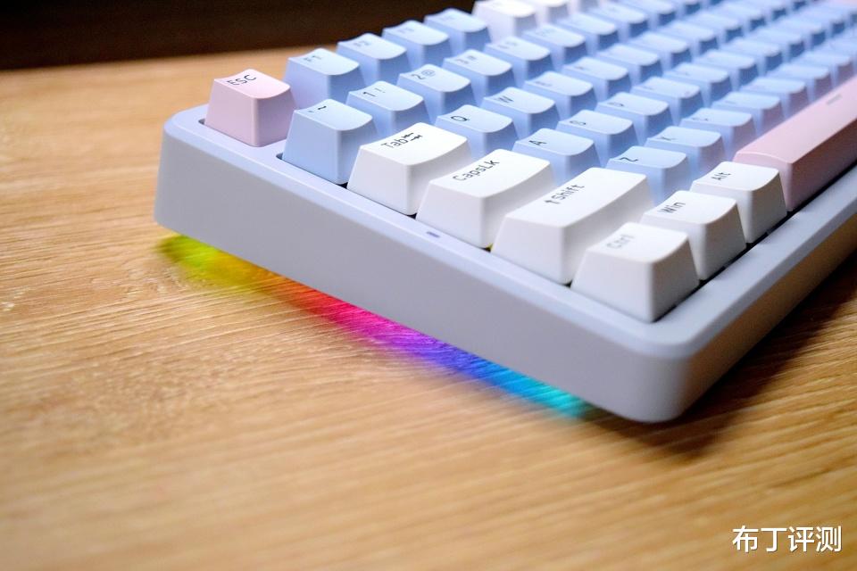 雷柏V700DIY-98采用97键布局,像我手中的莫奈仙踪版本,采用白、蓝、粉三种配色键帽,而且支持全键无冲突、96键可编程,可以轻松满足用户的多种使用需求。