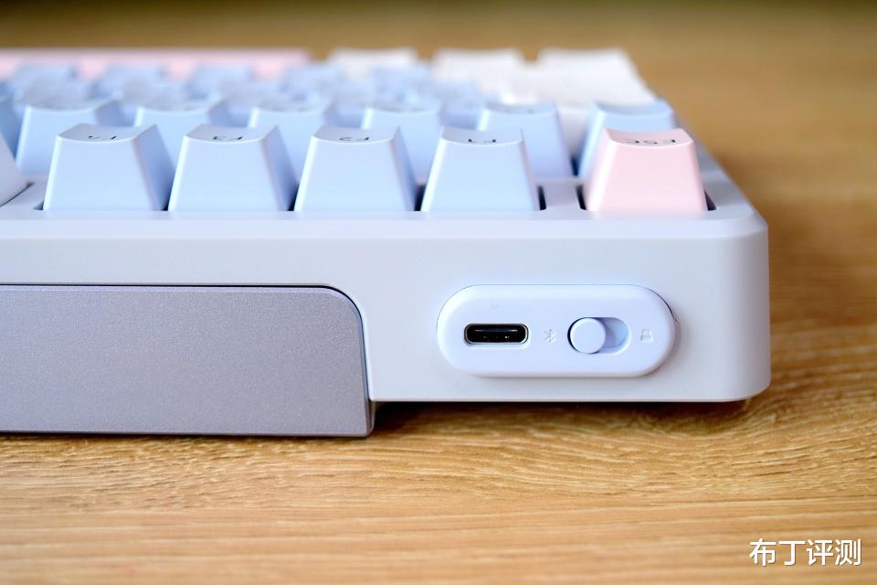 在键盘的后端左侧位置是Type-C接口和模式切换键,支持蓝牙5.0、无线2.4GHz和有线多种模式连接,而且能够同时连接最多5台设备,只需通过滑动模式切换键即可快速闪切,能够轻松满足多设备使用需求。