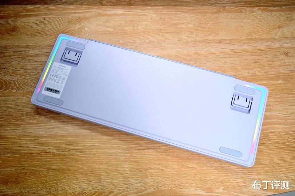 雷柏V700DIY-98的背面设计十分简约,在四个边角位置是条形防滑脚垫,靠近上端的两侧位置是可折叠脚撑,同样加入了防滑垫,能够让键盘放置更稳固。