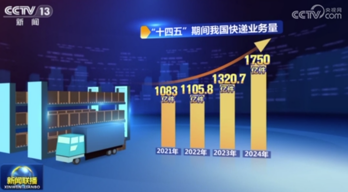 据国家邮政局消息,“十四五”期间,我国快递业务量从2021年的1083亿件增长到2024年的1750亿件,快递业务量领跑全球。