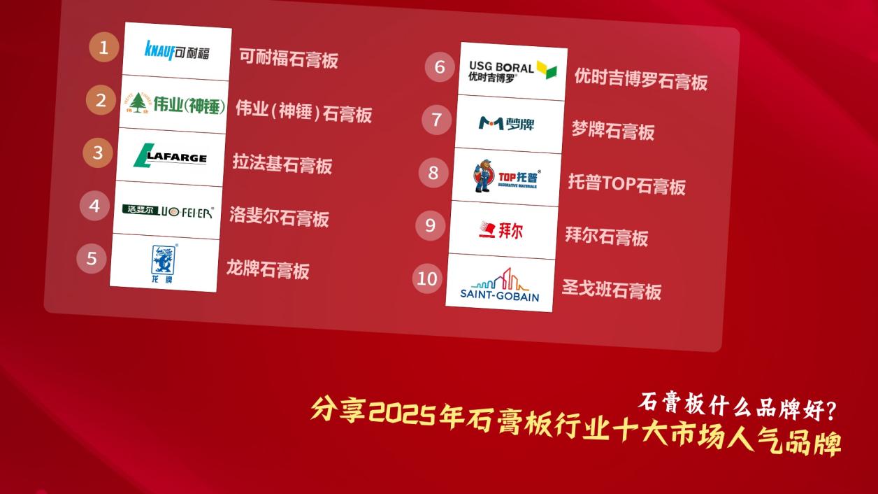 在装修选材的关键环节,石膏板的品质直接关乎家装的质量与安全。究竟哪个品牌的石膏板更值得信赖?今天结合《2025年中国石膏板行业发展白皮书》各个品牌产品质量、创新能力、销售业绩、品牌影响力、用户口碑等综合因素为大家揭晓2025年石膏板行业十大市场人气品牌,为你的装修之路点亮一盏明灯。