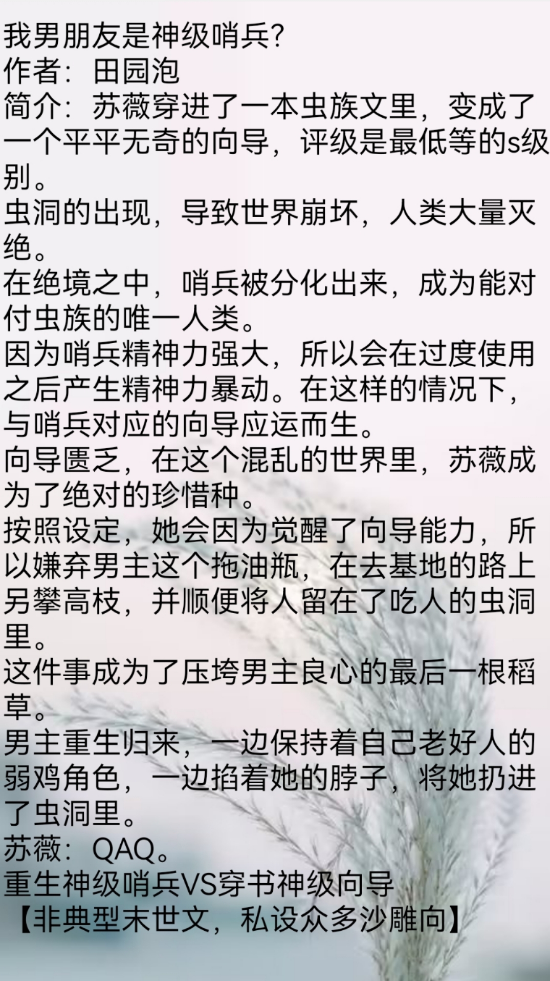 《我男朋友是神级哨兵?》作者:田园泡文章字数:530297字(完结)文章类型:穿书 复仇虐渣 虫族 轻松 哨向《穿成年代