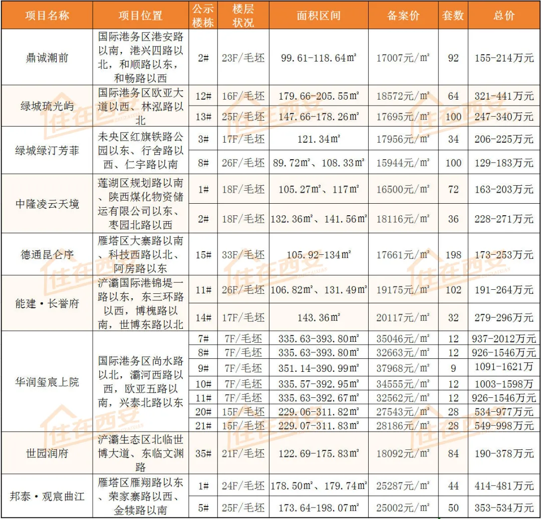 价格公示的项目中未央区团结板块的绿城绿汀芳菲、以及浐灞国际港灞河沿线的华润玺宸上院是纯新盘首次取价,其余均为老盘加推。
