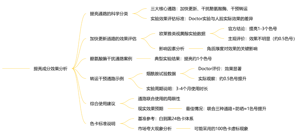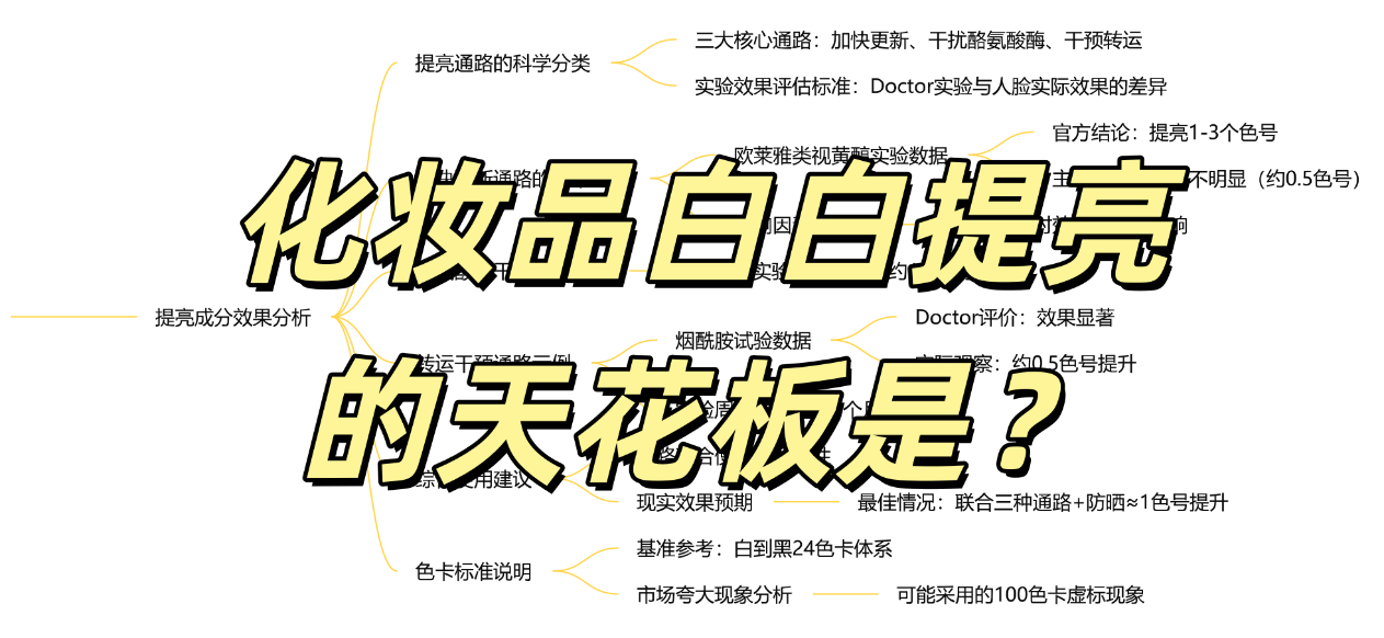 本文分析了皮肤提亮的三大通路及其效果,指出在实际应用中联合使用多种通路并做好防晒的情况下,提亮一个色号已属不易。