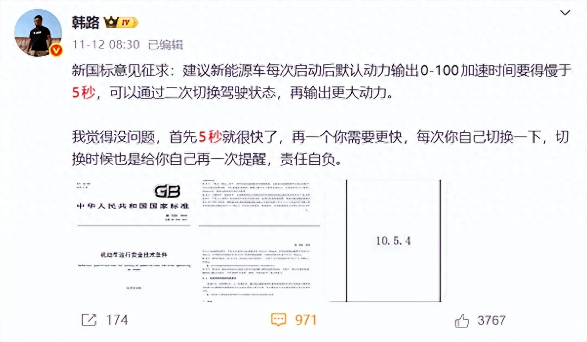 消息一经公布,一石激起千层浪,引发网友广泛热议。对此,知名车评人、汽车大V韩路表示:“新国标意见征求:建议新能源车每次启动后默认动力输出0-100加速时间要得慢于5秒,可以通过二次切换驾驶状态,再输出更大动力。”