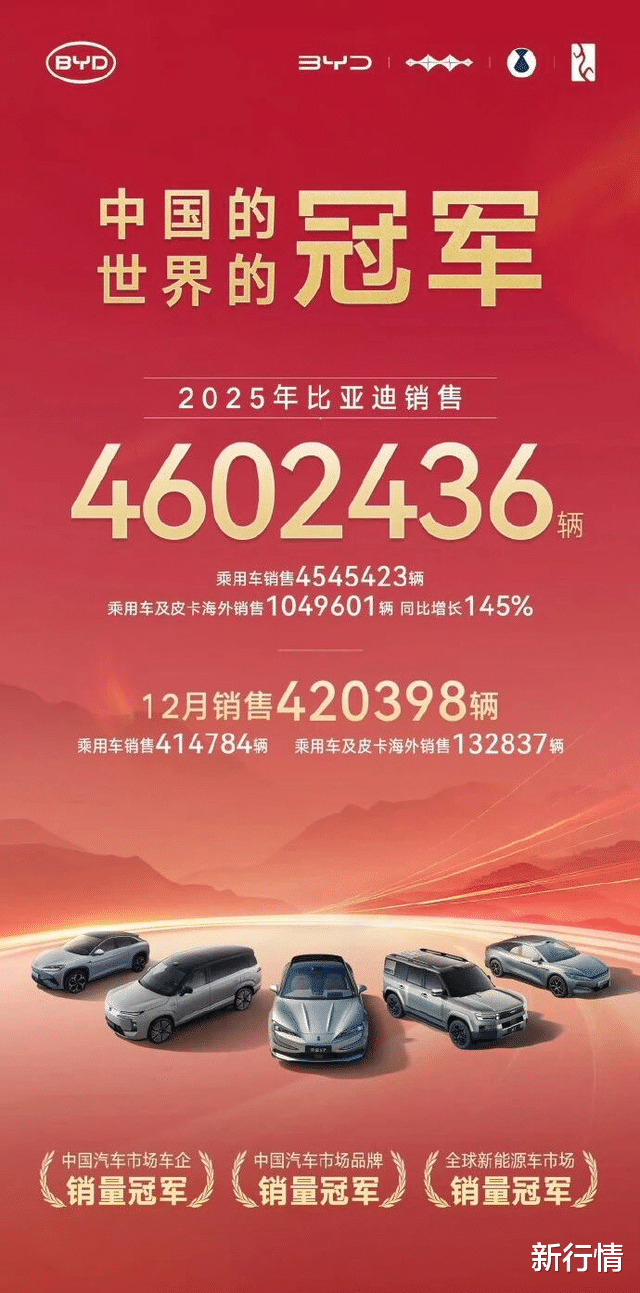 2025年,比亚迪全年销量达460万辆。其中纯电车型225万辆,以超60万辆的优势,首次在年度维度上超越特斯拉,登顶新能源汽车全球第一。