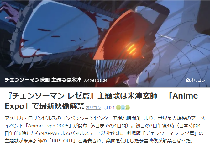 5.MAPPA剧场版《ChensomanReze篇》主题曲为米津玄师的《IRIS OUT》当地时间3日起,世界最大规模的Anime Expo 2025在美国洛杉矶会展中心开幕(截止到6日的4天)。第一天的3日下午4点(日本时间4日上午8点)开始MAPPA剧场版《ChensomanReze篇》的主题曲发表为米津玄师的《IRIS OUT》,使用乐曲的预告影像解禁。