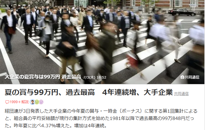 1.日本夏季奖金连续4年增加