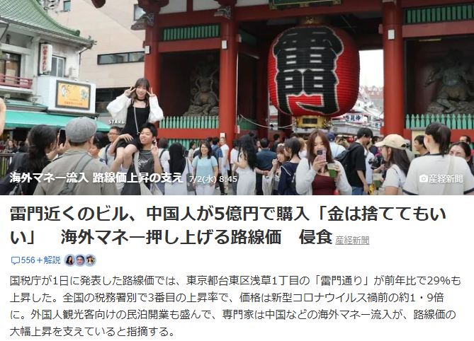 2.日本国税厅公布由于海外货币流入 路线价格大幅上升日本国税厅1日公布的路线价格中,东京都台东区浅草1丁目的“雷门大街”比去年上升了29%。这是全国各税务局的第三个上升率,价格约为新冠肺炎疫情前的1.9倍。面向外国游客的民宿开业也很盛行,专家指出,中国等海外货币的流入,支撑着路线价格的大幅上升。