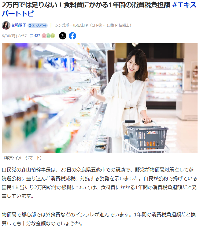 日本自民党干事长森山裕29日在奈良县五条市的演讲中表示,在野党将对抗作为物价上涨对策加入参议院选举公约的消费税减税。关于自民党在公约中提出的国民每人支付2万日元的根据,他说这是食品费所需的1年消费税负担额。