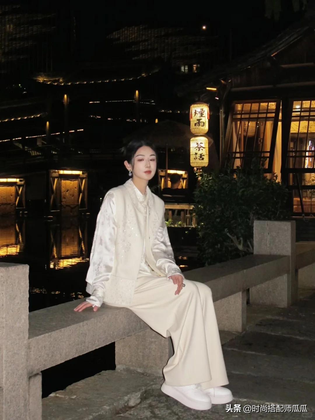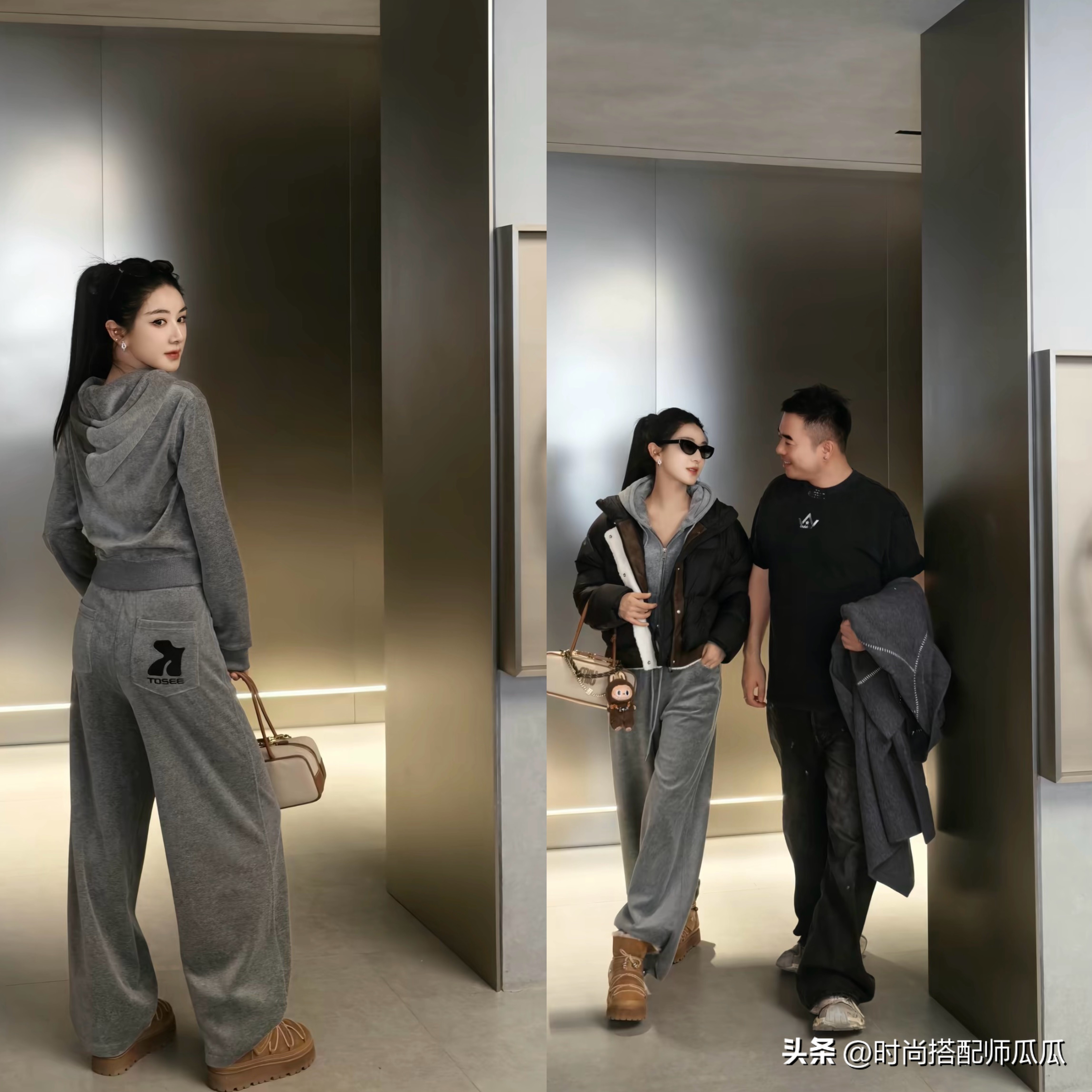 羽绒马甲和阔腿裤的搭配既温暖又不失时尚,浅灰色和深灰色的渐变色效果提升了穿搭的高级感。