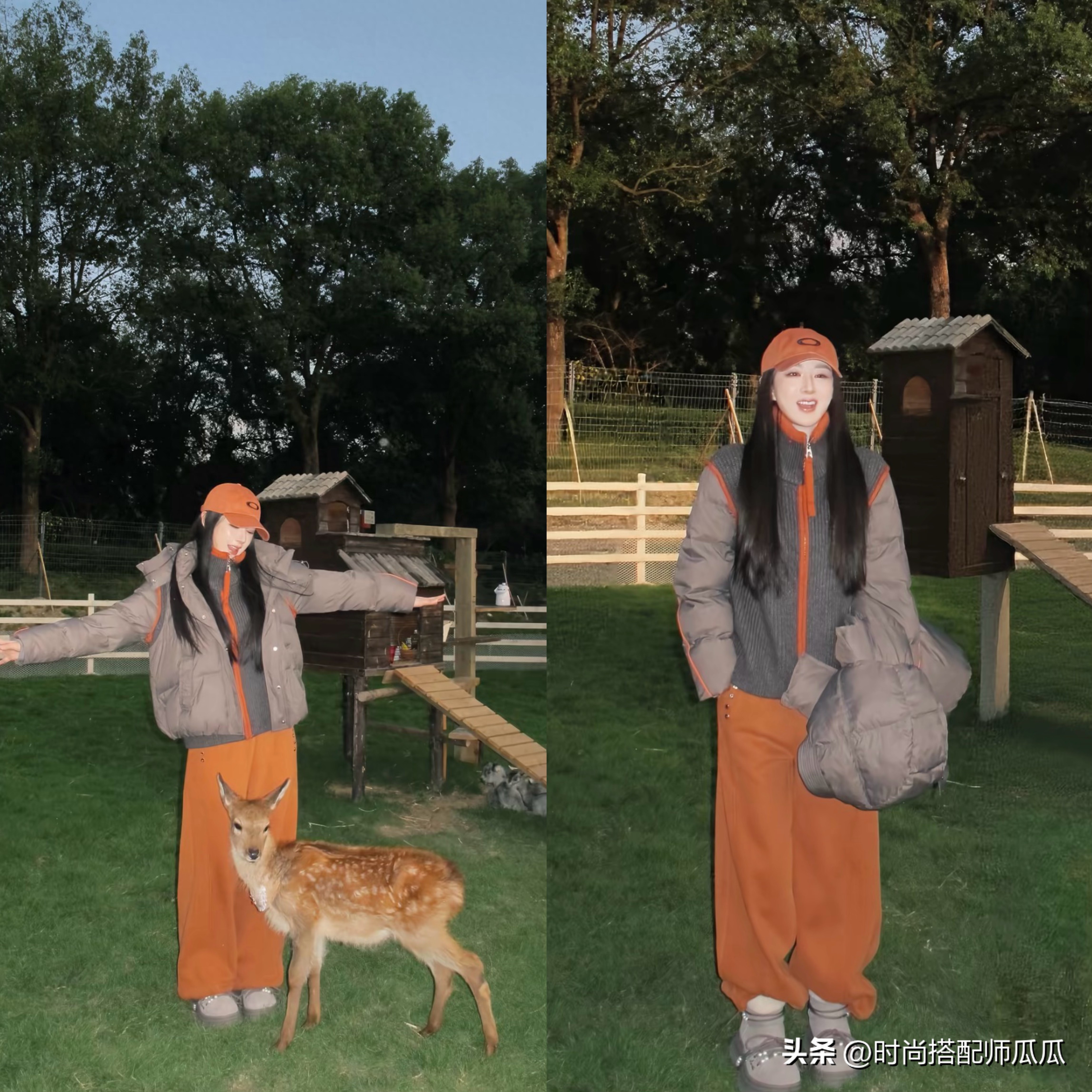 这一套同色系搭配大胆而充满活力,橘色的阔腿裤与同色系的棒球帽不仅让整体造型看起来统一和谐,还增添了一份青春与活力。