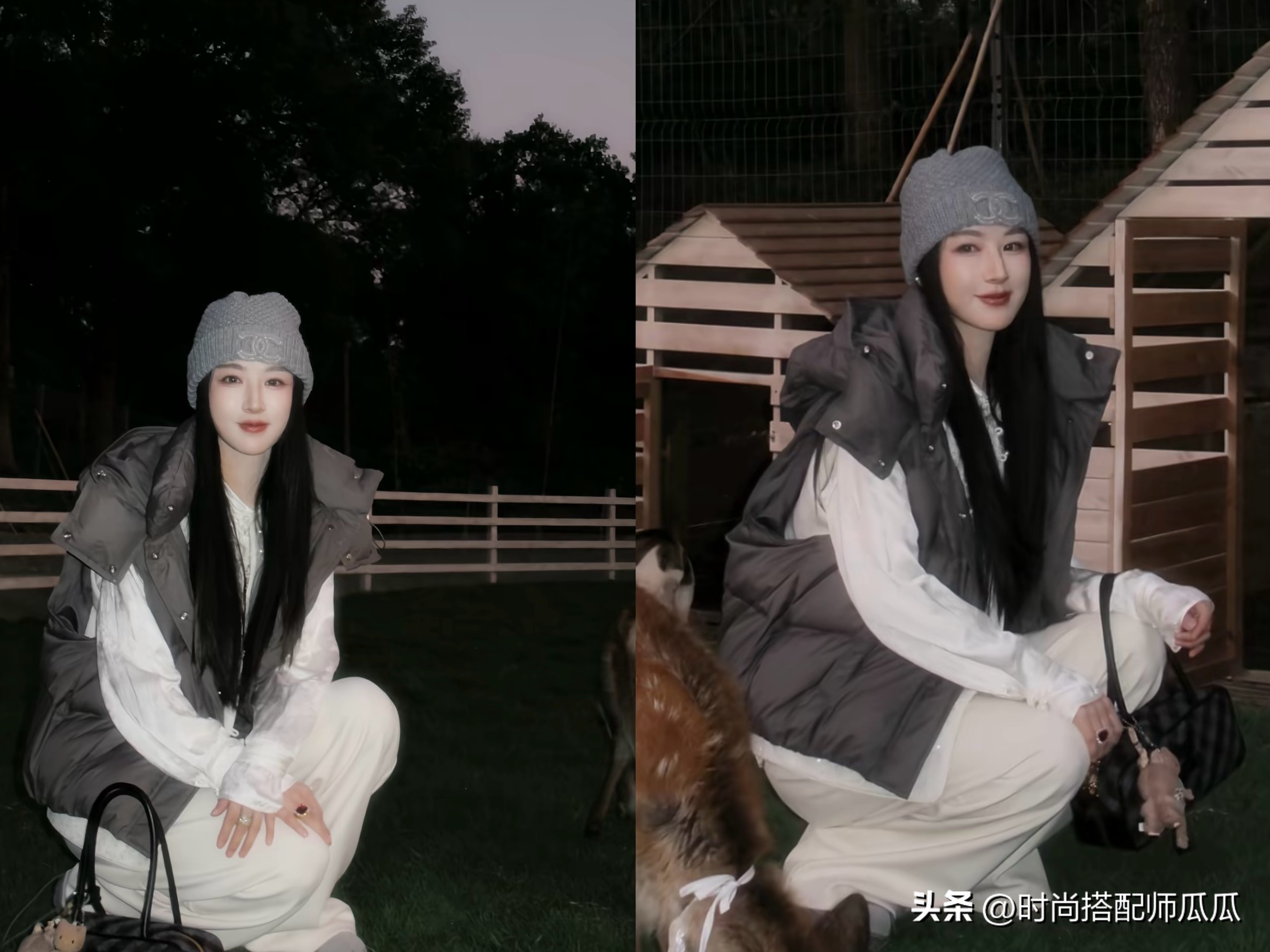 针织帽为整体造型增添了温暖感,羽绒马甲和阔腿裤则让整体看起来更加舒适而具有设计感。