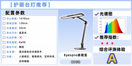 小孩护眼灯什么牌子的好用?孩视宝OP58外观质感尚可,采用铝合金材质搭配肤感玻璃与万向球转轴,配色高级;功能上配备入席感应与智能感光,可自动开关灯与调节亮度,避免孩子忘记操作。从核心性能来看,它的光谱连续性不错,没有明显高峰存在,而且蓝光峰值是在0.8附近,有一定的护眼效果。从灯面来看整灯做了加长加宽加高设计,配合36W大功率直发光光源,照明范围较广,能覆盖大尺寸书桌,但由于直发光的光线比较强,可以看到它的灯面还是有点轻微刺眼的。