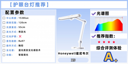 小孩护眼灯什么牌子的好用?霍尼韦尔X5护眼台灯整体设计偏向简约现代风,灯头长度约55厘米,配合约50厘米的延展灯臂,可覆盖约1.2米的桌面,适合双人书桌或较宽办公台使用。三段式灯臂搭配多组独立转轴,可分段调节角度,并能较好锁定位置,调节手感稳固,不易松动。智能功能方面,支持环境光自适应调光。不过实测时蓝光峰值仍偏高,对于光敏人群可能需要注意。