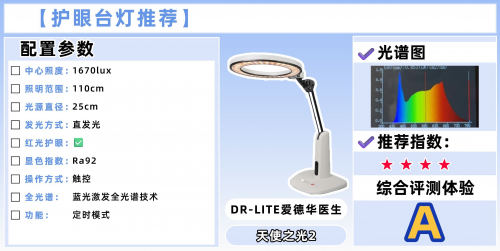 小孩护眼灯什么牌子的好用?爱德华医生天使之光2台灯造型新颖,采用双轴调节配合环形发光面,环形设计可扩大照明面积,有效照明范围达到了110cm,灯面也做了偏光设计以减少重影。功能调节集中在底座,开关与模式键操作顺畅,适配学习、工作等基础场景。但短板也比较明显,直发光设计导致光线集中,直视灯面容易看到明显线条光斑,光滑书面也可能出现反光;虽然它具备红光增益效果,但它的蓝光峰值接近1.0而且有益的青光的也偏少峰值只在0.6左右,护眼性能与价格匹配度一般。