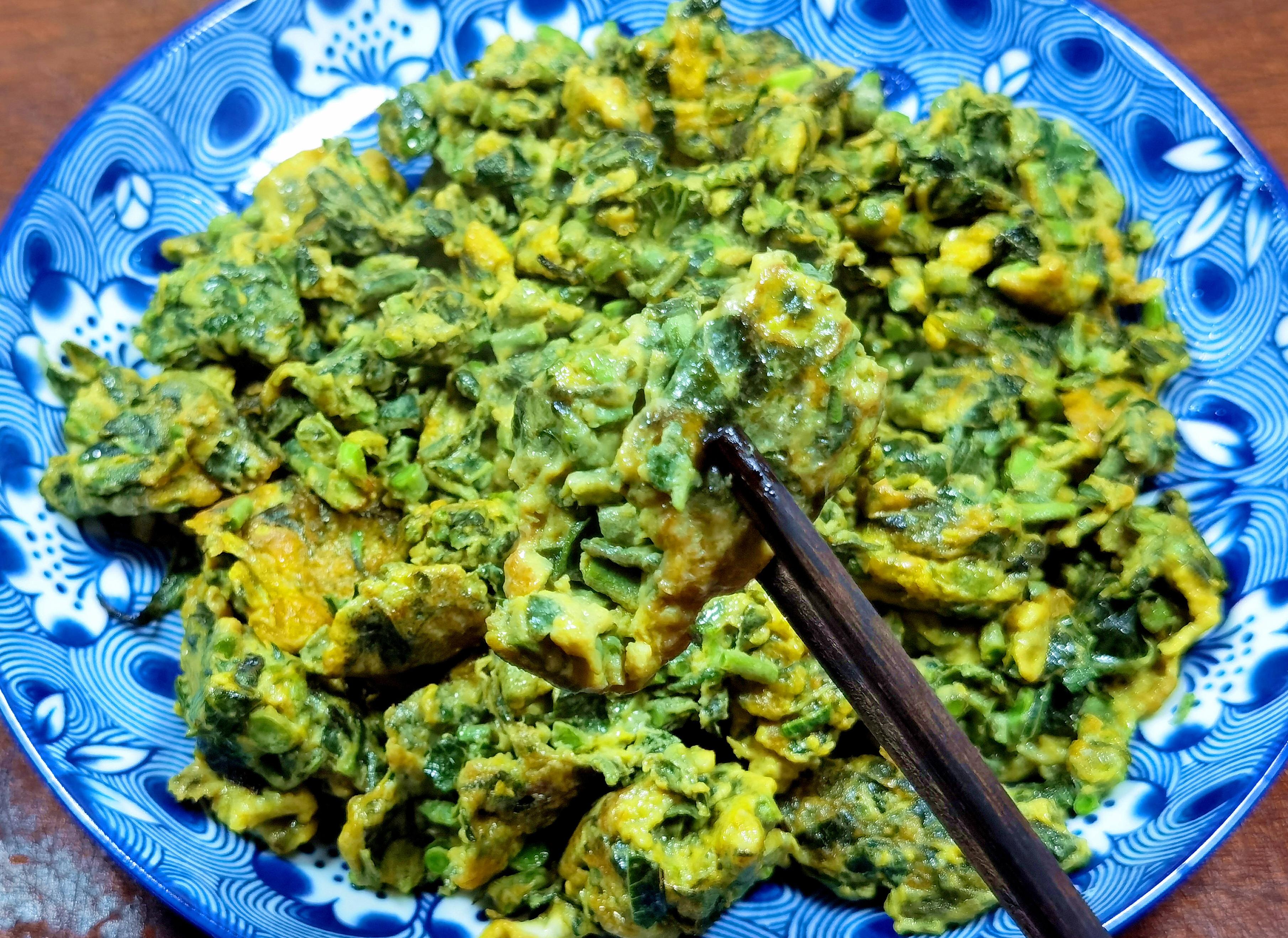煎香椿炒的鸡蛋金黄翠绿,香味浓郁,他还笑称,简直是“春天的味道”。
