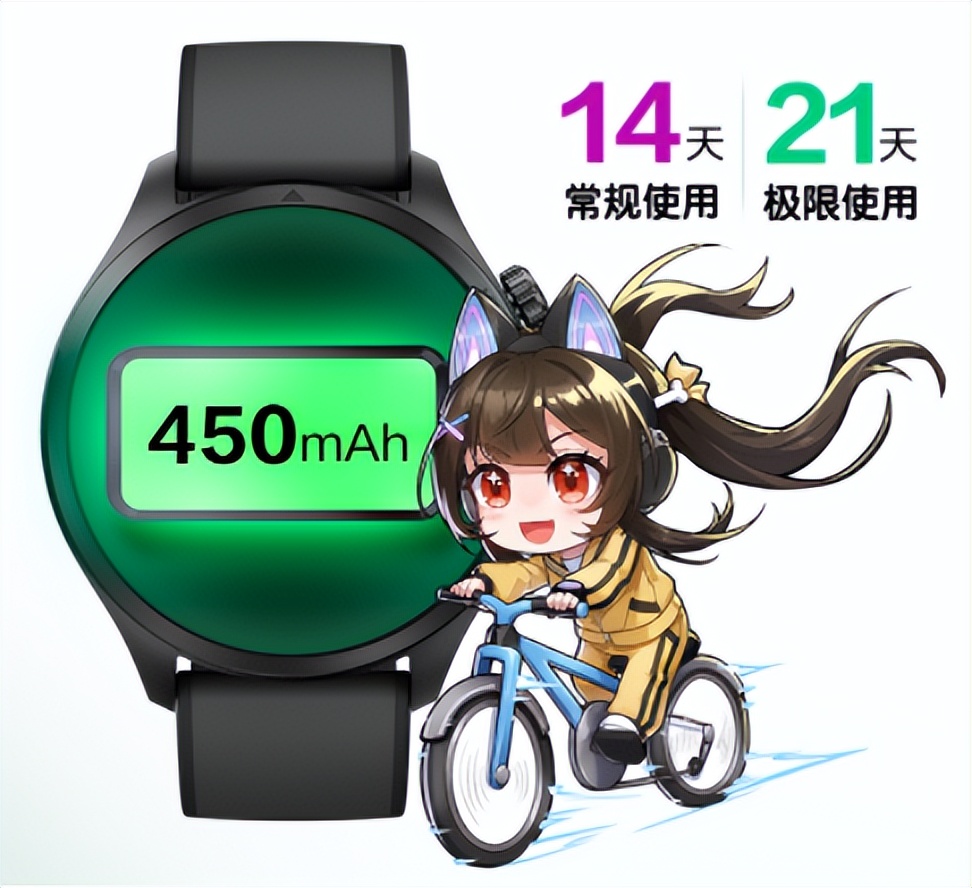 悦心G1搭载450mAh大容量电池,在开启AOD、动态表盘,且用户经常运动的情况下续航可达一周;关闭AOD、使用静态表盘,用户偶尔运动的情况下续航可达14天,开启省电模式的极限使用场景下续航更是可达21天。